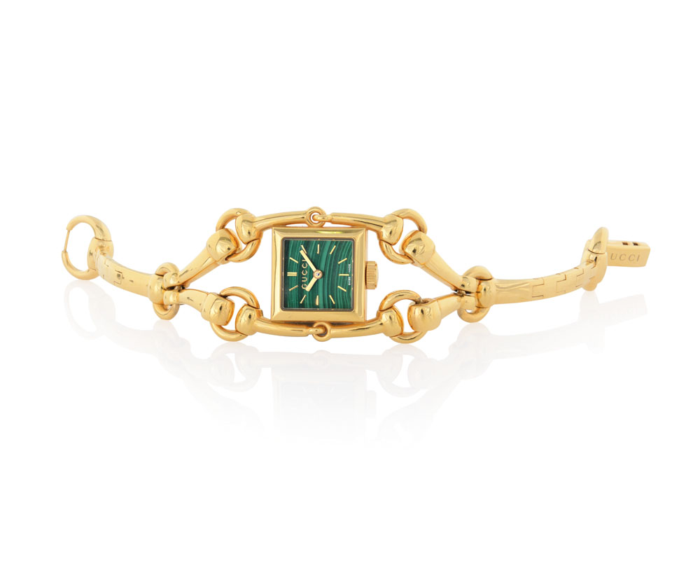Cassa carré in oro giallo 18 kt con corona al 6 inserita tra due catene di maglie rigide sagomate a staffe e terminati in unica catena terminante con staffe sulla chiusura (come nuovo). Quadrante in malachite con indici applicati (come nuovo. Movimento al quarzo (ottimo). Quadrante, cassa e bracciale firmati.