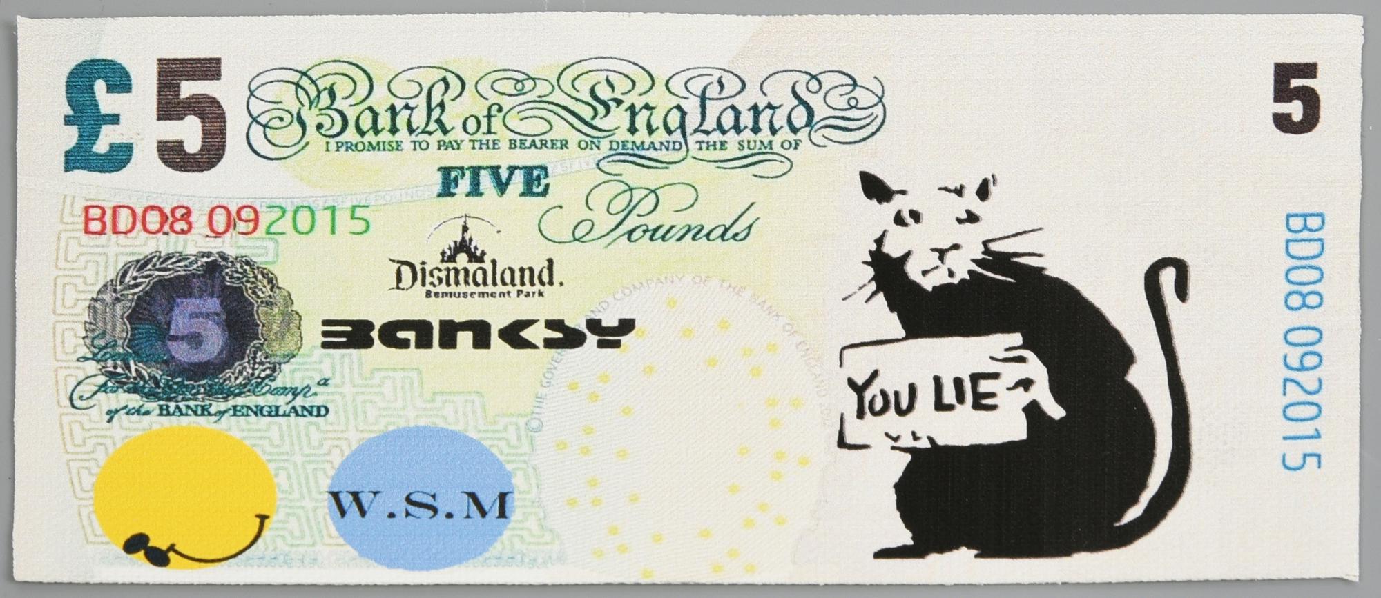 Banksy DISMAL 5 POUND serigrafia e stencil su tela, cm 9x18 timbro "Dismaland...