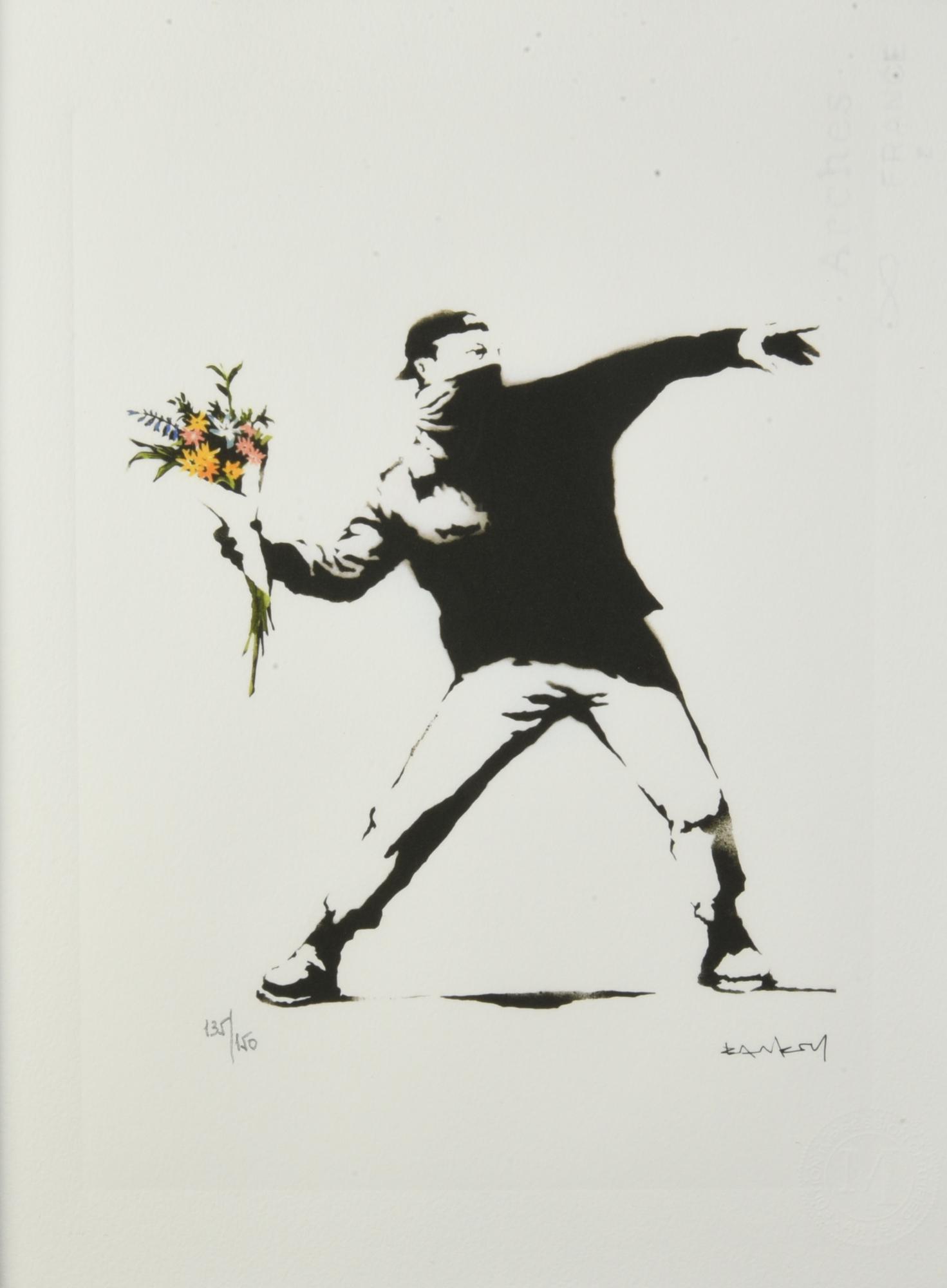 Da Banksy LOVE IS IN THE AIR eliografia su carta Arches, cm 38x28; es....