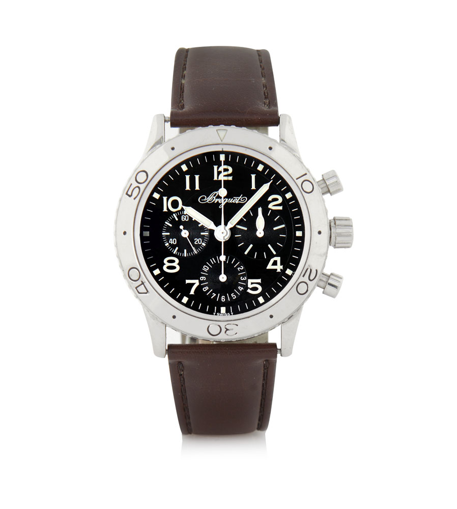 Diam. mm 39. C. stainless steel, coin-edged band, screwed case back, round buttons, graduated and revolving bezel (very good). D. black with luminous indexes, Arabic numerals and hands, 30 minute and 12 hour registers (as new). M. self-winding (very good). Dial, case and movement signed. Accompanied by Breguet stainless steel deployant clasp.