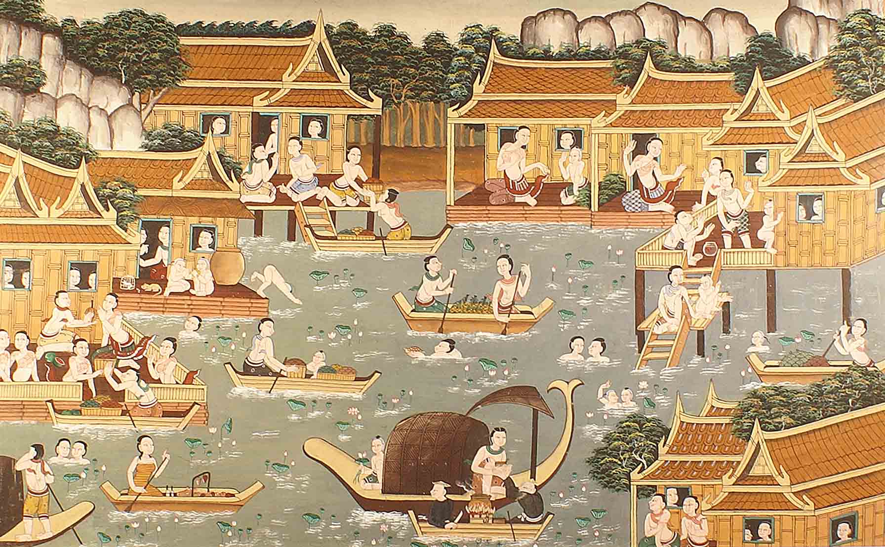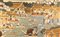 Scuola orientale del XX secolo, "Villaggio con figure", tempera su tela, cm. 80x124.