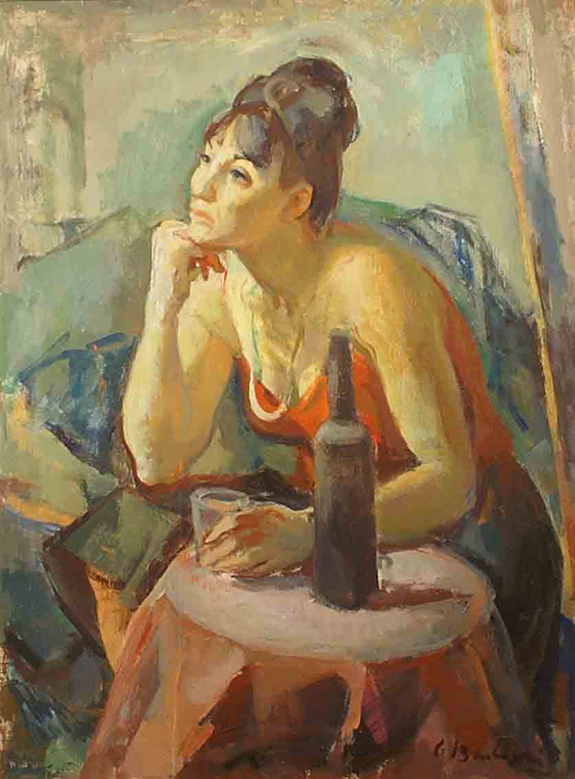 Firma indecifrabile (XX secolo), "Donna al bar", olio su tela, cm. 80x60, firmato in basso a destra.