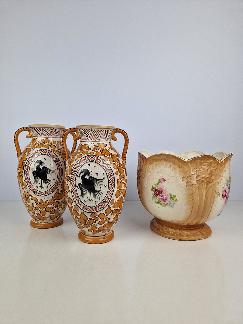 Lotto unico composto da una coppia di vasi ed un cachepot decorati