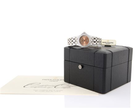 Diam. mm 26. C. stainless steel with case back secured by screws, graduated bezel with sapphire crystal (very good). D. pink with applied indexes and Roman numerals, luminous hands and date at 3 (as new). M. quartz (very good). Stainless steel bracelet with double-deployant clasp. Dial, case, movement and bracelet signed. Accompanied by Patek Philippe box and certificate dated 2007.