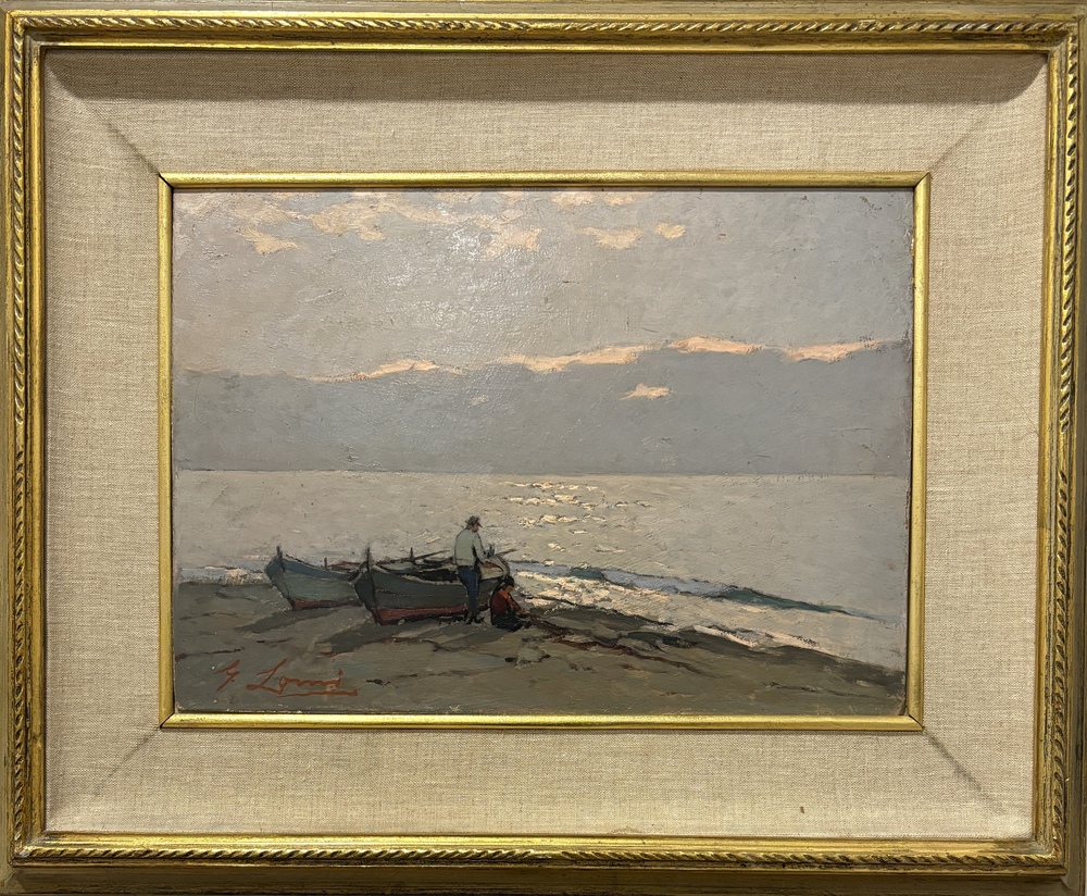Giovanni Lomi Livorno 1889 - 1969 Marina con barche Olio su cartone cm 32x23