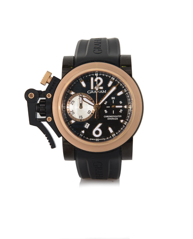 Diam. mm 47. C. black stainless steel and 18K pink gold with case back secured by screws, button through the crown with push lever, rectangular button at 10, downturned lugs and sapphire crystal (very good). D. black with luminous indexes, Arabic numerals and hands, 30 minutes register and date at 7 (very good). M. self-winding (very good). Dial, case and movement signed. Accompanied by Graham rubber strap, black stainless steel buckle, box and certificate.
