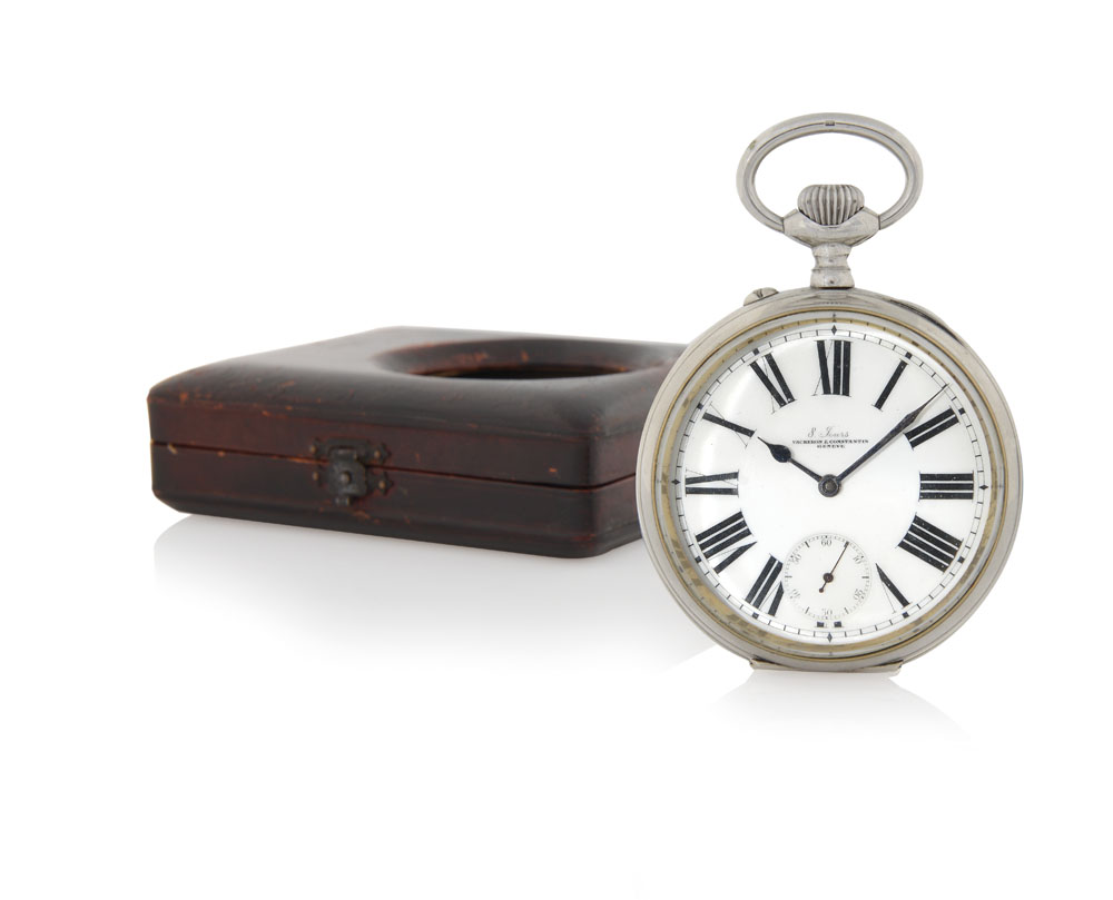 Diam. mm 76. C. openface, smooth metal (very good). D: white enamel with painted Roman numerals, subsidiary seconds (original, very good). M. anchor escapement, keyless dress, 8 days (very good). Dial and case signed, movement numbered. Accompanied by presentation box.