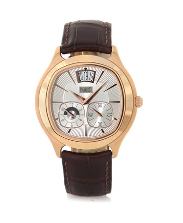 Diam. mm 42. C. 18K pink gold with transparent case back secured by screws, sapphire crystals (very good). D. gold silvered with applied indexes, seconds at 4 and second time zone with night/day division at 8, aperture for date at 12 (as new). M. cal. 850P self-winding (very good). Dial, case and movement signed. Accompanied by Piaget strap, 18K pink gold deployant clasp, box and certificate dated 12/2009.