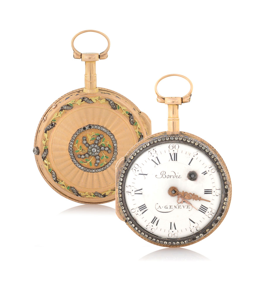 Cassa in oro giallo 18 kt con incisione a raggiera, decori applicati in oro, argento con rose di diamante e smalto verde, lunetta in rose di diamante (buono). Quadrante in smalto con numeri romani e arabi (originale, sbeccatura al foro di carica). Movimento con scappamento a verga, carica a chiavetta (buono). Quadrante e movimento firmati.
