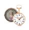 Cassa in oro giallo 18 kt liscia con copricassa in oro in oro centrata da miniatura raffigurante fanciulla entro ricca cornice in smalto blu e rose di diamante (buono). Quadrante in smalto con numeri romani e arabi (originale, buono). Movimento con scappamento a verga, carica a chiavetta (buono). Quadrante e movimento firmati.