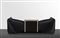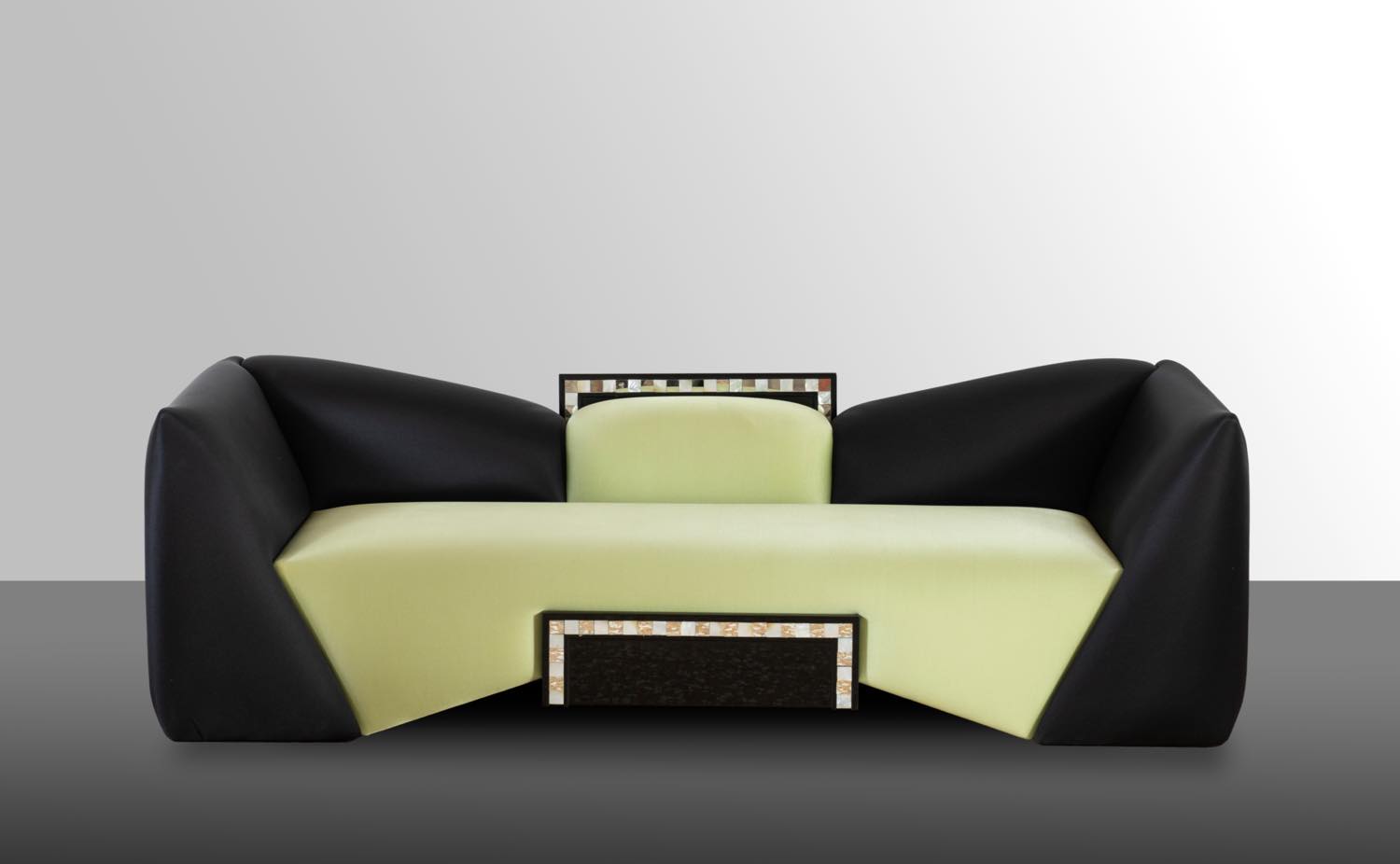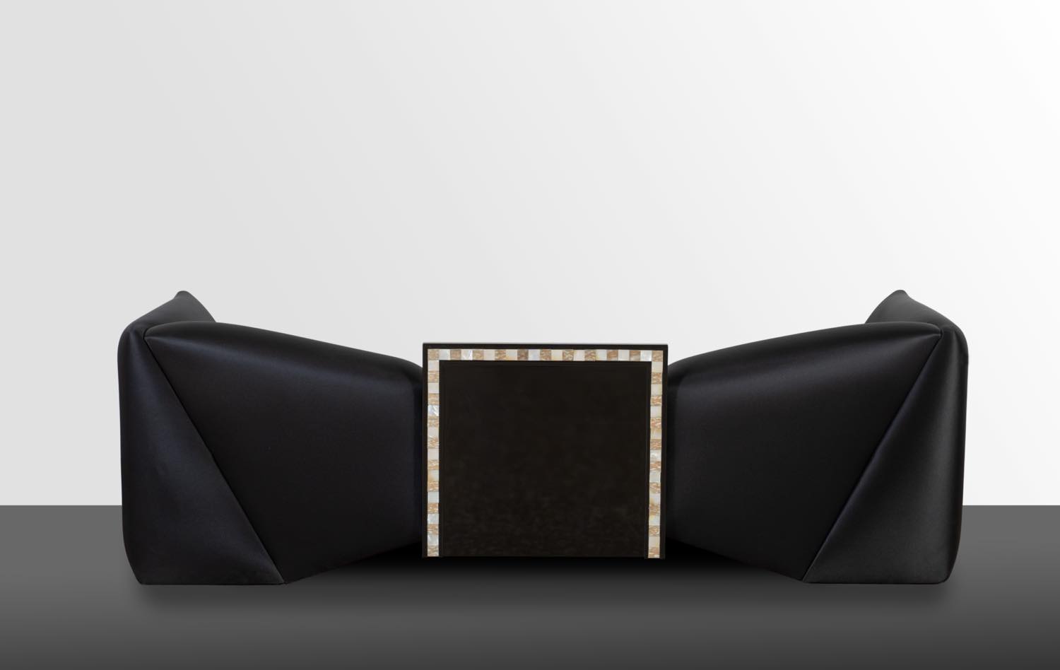 Manuel Da Costa per Arpex International, Divano collezione “Fiocco”, Roma, inizio Anni ‘80.Struttura imbottita e rivestita, particolari in legno laccato nero con intarsi in madreperla e specchio bifiacciale, H cm 68x235x97, H seduta cm 45