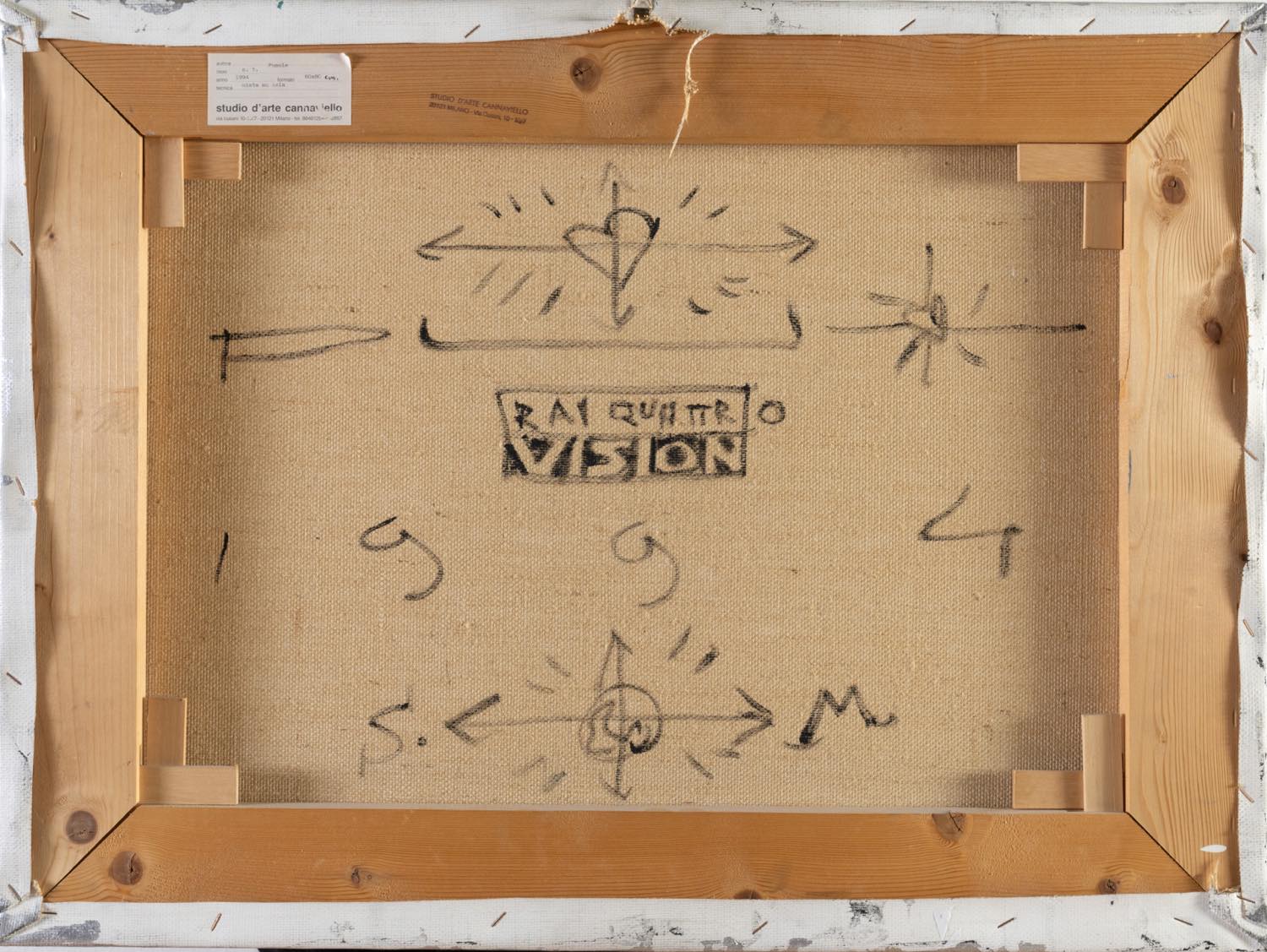Pierluigi Pusole (Torino 1963), “Senza titolo”, 1994.Tecnica mista su tela, reca al retro simboli grafici, iscrizione “Rai Quattro/Vision” ed etichetta e timbro dello Studio Cannaviello - Milano, H cm 60x80. - Provenienza: Collezione privata; Studio d’Arte Cannaviello - Milano.Opera accompagnata da certificato di autenticità a cura dello Studio d’Arte Cannaviello - Milano con firma dell’artista.