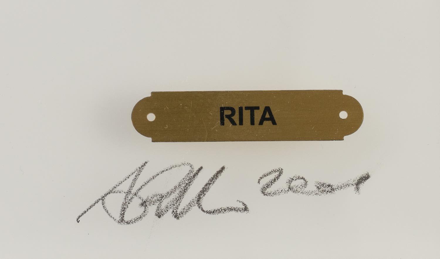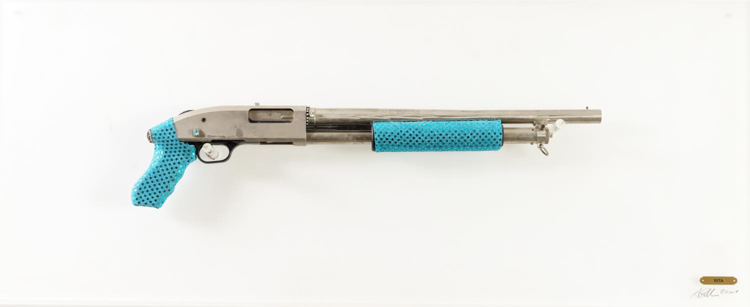 Antonio Riello (Marostica 1958), “Rita” 2001.Scultura in metallo con inseriti in tessuto e pietre montata su lastra in plexiglas, presenta firma e data in basso a destra, reca targhetta con titolo, H cm 50x120. - Provenienza: Collezione privata.