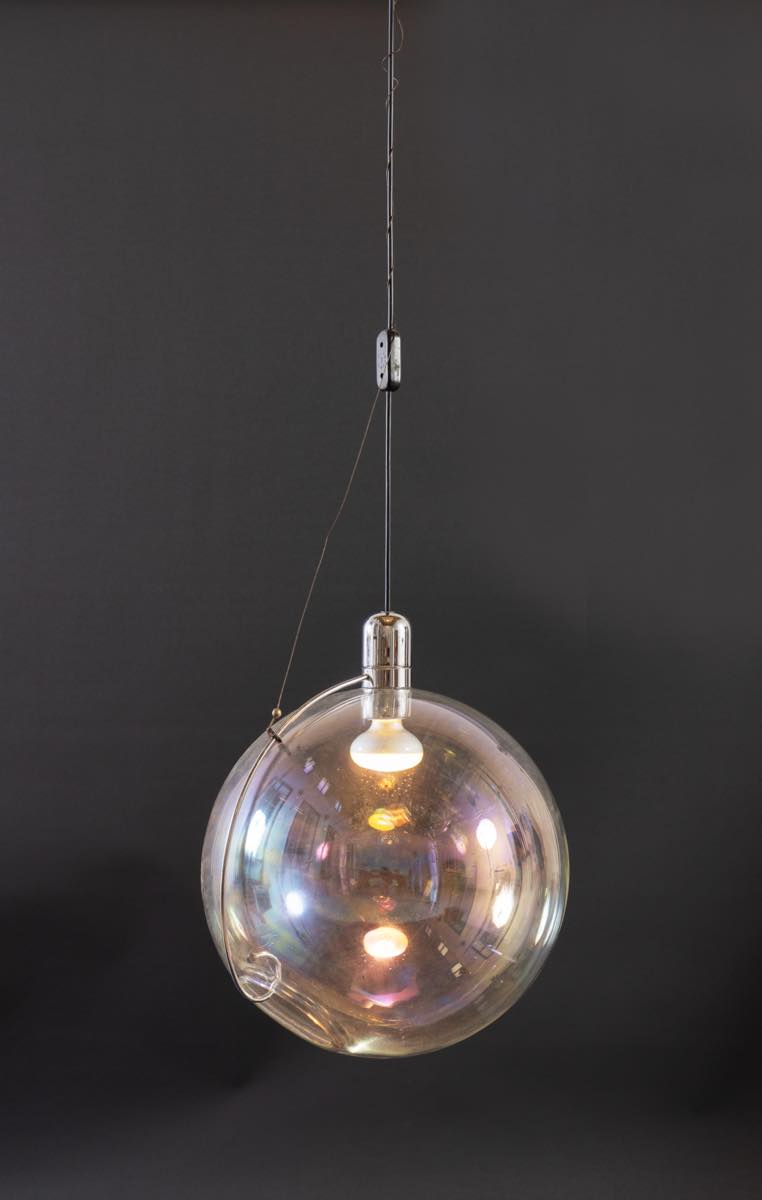 Carlo Nason per Lumenform, Lampada a sospensione “Sona”, Anni ‘70.Diffusore sferico in vetro soffiato e iridato, finiture e dettagli in metallo cromato, diametro cm 35 (lievi usure)