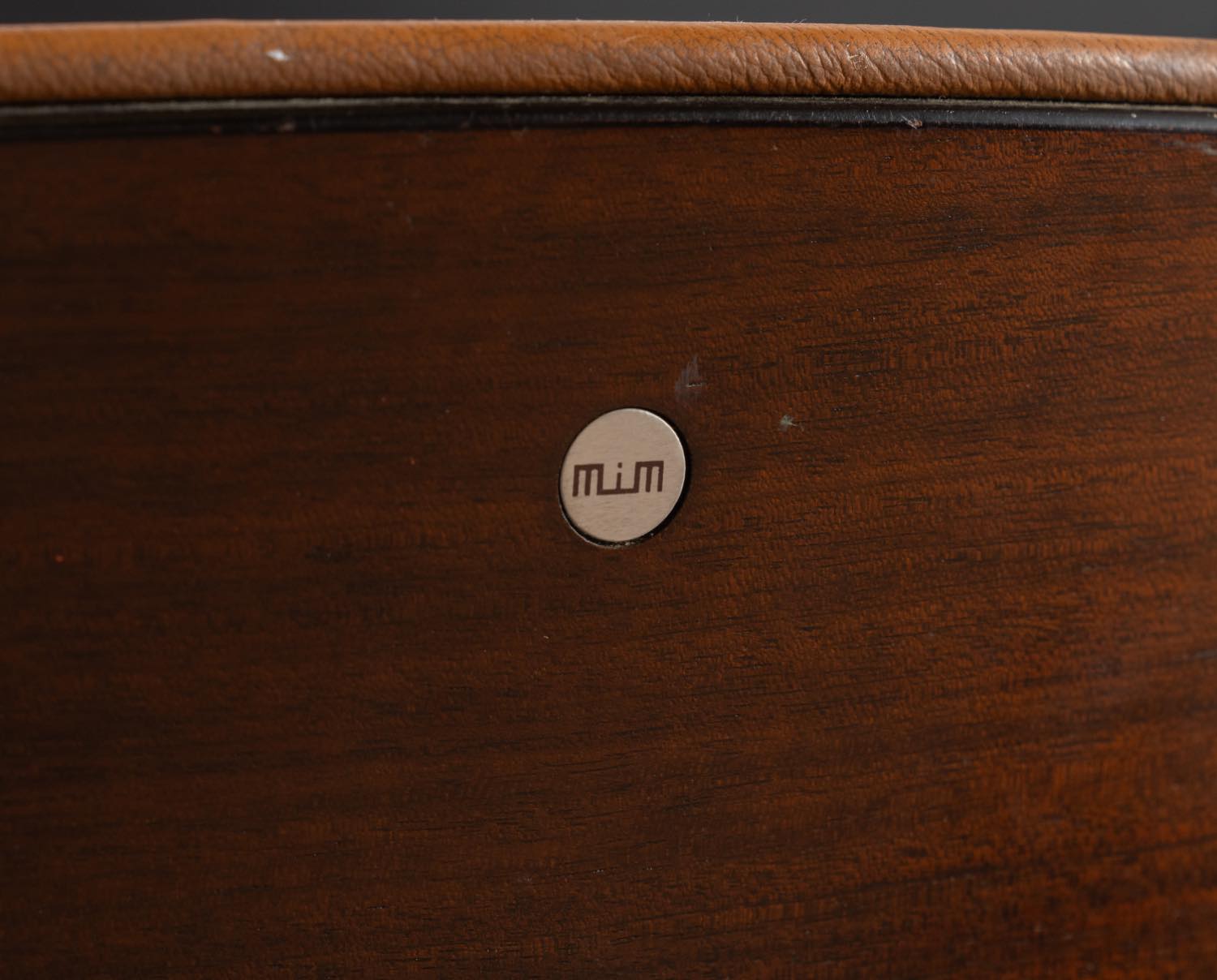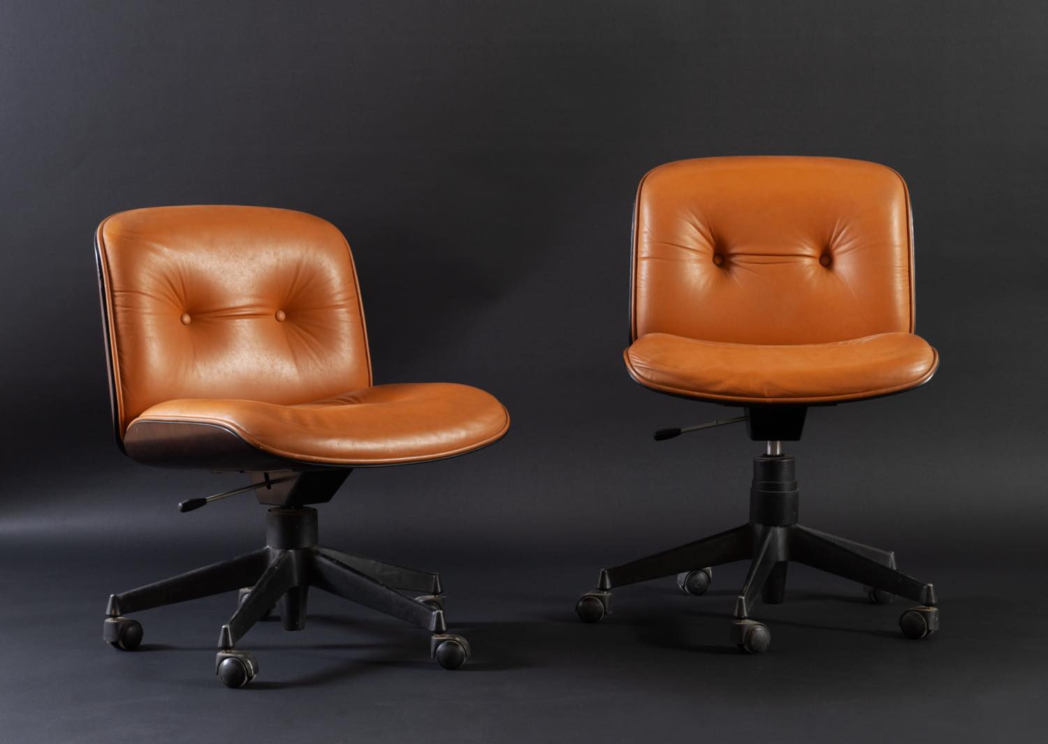 Ico e Luisa Parisi per MIM, Coppia di poltroncine girevoli, Roma, Anni ‘60.Struttura regolabile in legno curvato, seduta e schienale imbottiti rivestiti in pelle marrone, recano al retro marchio della produzione, H cm 85x55x51, H seduta cm 51 (lievi usure)
