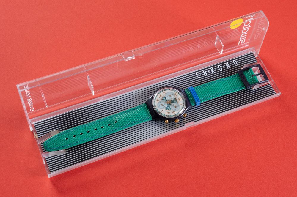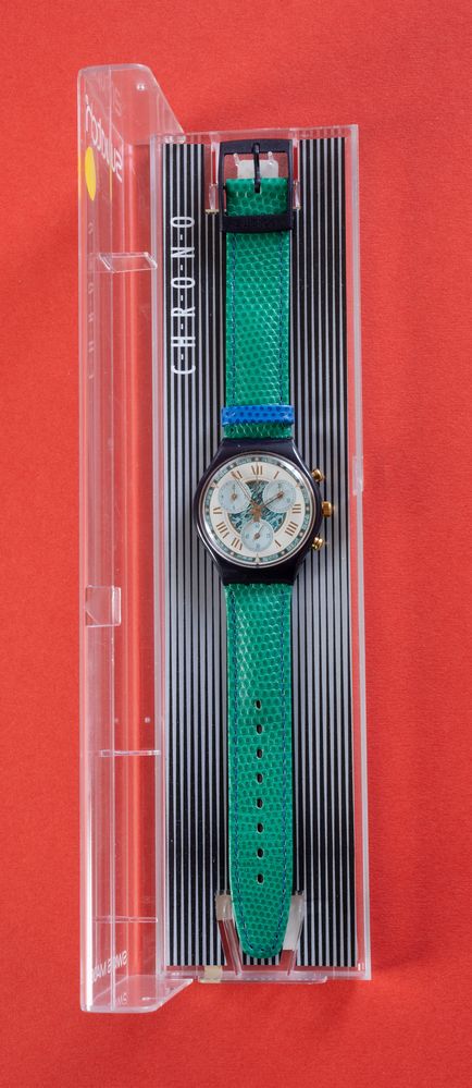 SWATCH CRONOGRAFO NUOVO, 1993. Cassa nera, quadrante bianco e verde, cinturino in pelle di colore verde. Nuovo fondo di magazzino con scatola e documenti.