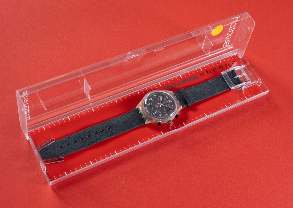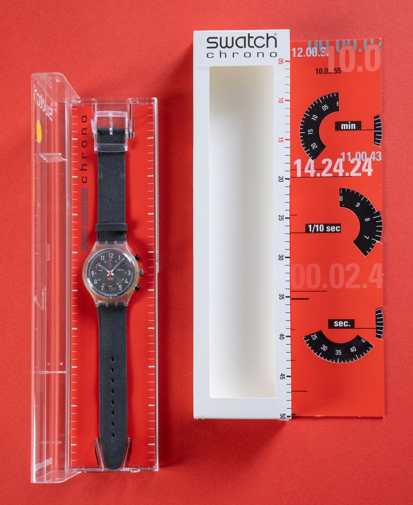 SWATCH CRONOGRAFO NUOVO, 1996. Cassa trasparente, quadrante grigio, cinturino in pelle di colore grigio. Nuovo fondo di magazzino con scatola e documenti.