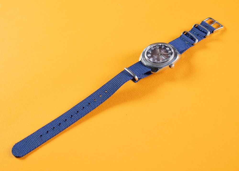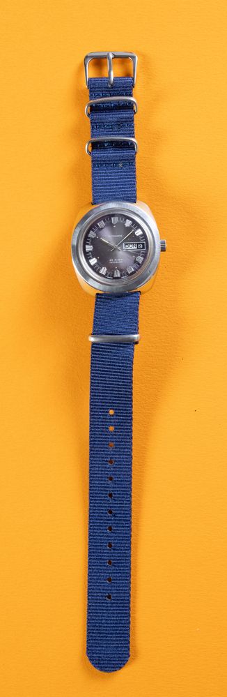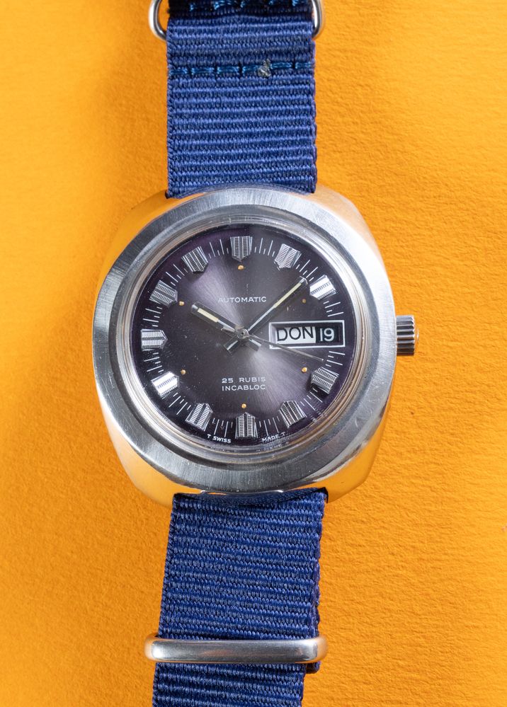 MIREXAL DIVER, anni '70. Cassa tonneau in acciaio, quadrante viola degradé, indici applicati, movimento a carica automatica, cinturino in tessuto. Diametro 37 mm.