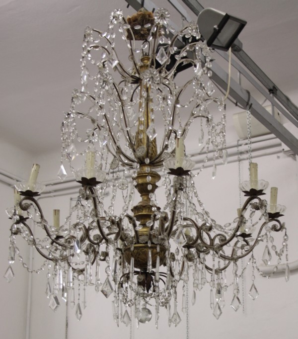 Firmato, datato. Lampadario tipo genovese con fusto in legno dorato e dieci bracci in ferro battuto, contornato da perline in vetro e gocce in cristallo. Modello Luigi XVI. XVIII secolo. Difetti. Mis. Alt. cm. 123 Diam. cm. 100 ca.