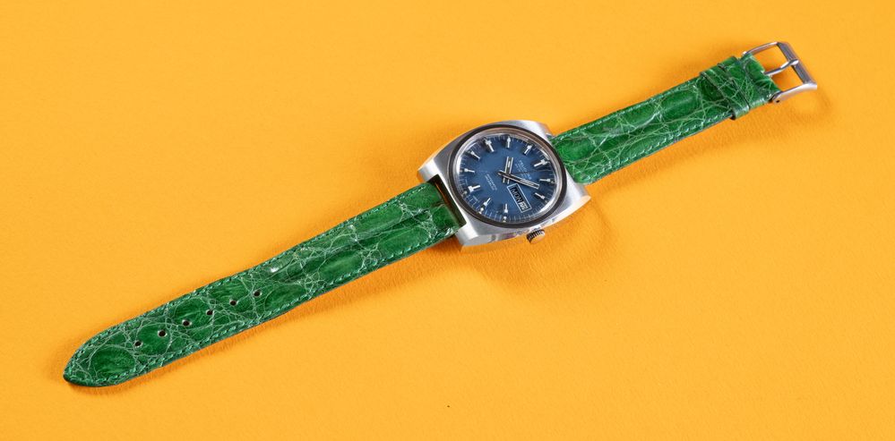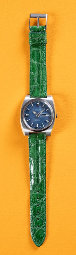 FELICITAS NEUCHATEL, anni '70. Cassa in acciaio, quadrante blu, indici applicati, indicazione giorno e data, movimento a carica automatica, cinturino in pelle. Diametro 37mm.
