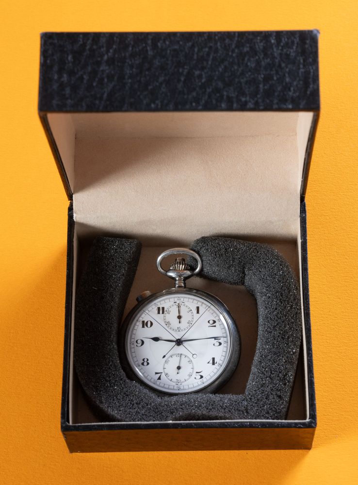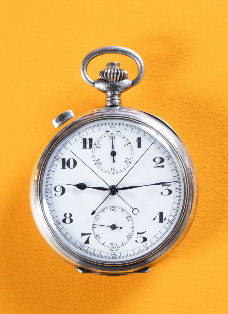 OROLOGIO DA TASCA CRONOGRAFO RATTRAPANTE, 1930. Cassa in argento, quadrante in porcellana, movimento cronografico con contatore sdoppiante (rattrapante). Diametro 52mm.