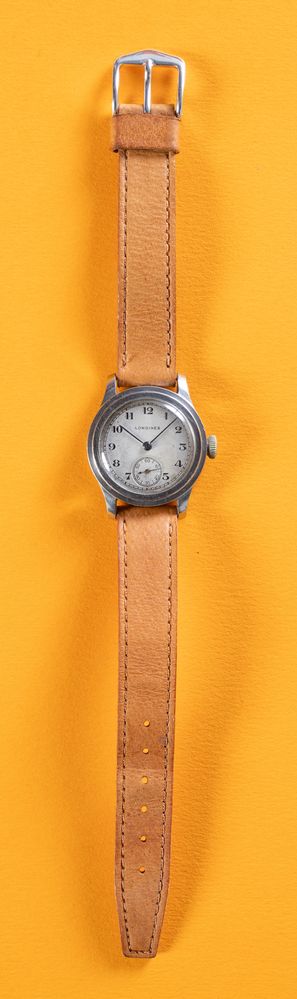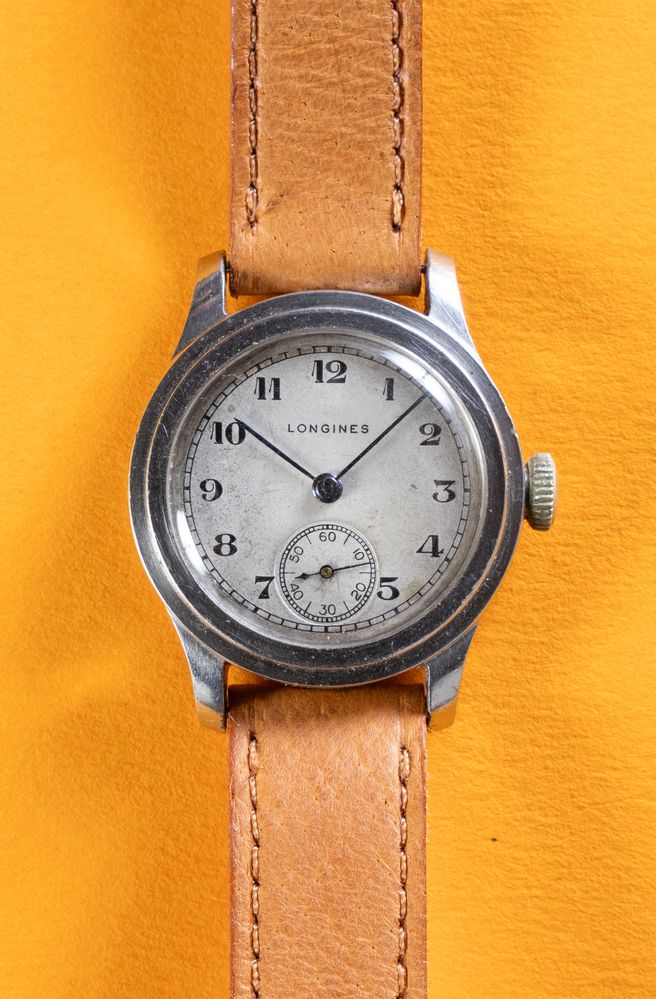 LONGINES TRE TACCHE, anni '40. Cassa rotonda in acciaio, quadrante grigio con...