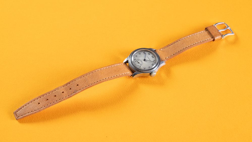 LONGINES TRE TACCHE, anni '40. Cassa rotonda in acciaio, quadrante grigio con numeri arabi, lancette a bastone, movimento a carica manuale, cinturino in pelle. Diametro 29mm.