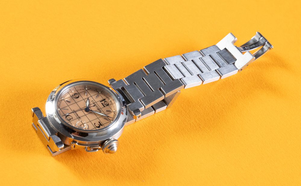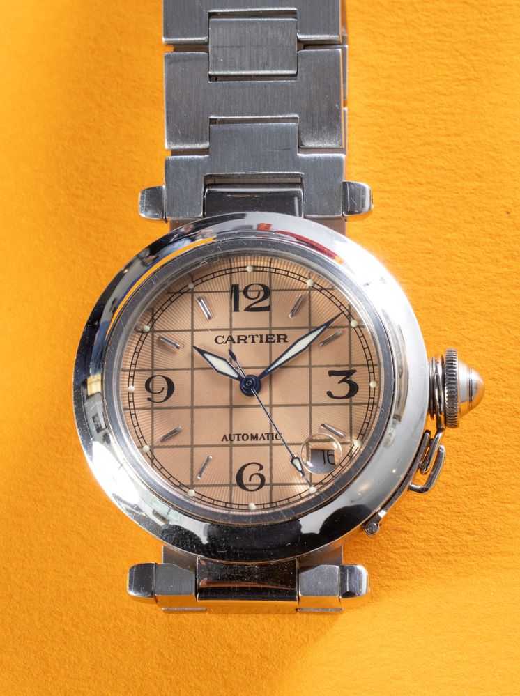 CARTIER PASHA, anni 2000. Cassa rotonda in acciaio, quadrante rosa salmone...