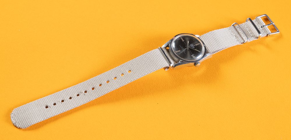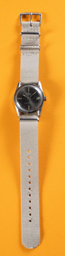 EDOX HYDROMATIC WATERPROOF, anni '70. Cassa rotonda in acciaio, quadrante grigio scuro con idici luminosi, indicazione della data, movimento a carica automatica, corona logata, cinturino in tessuto. Diametro 33mm.
