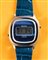 BULOVA LCD, anni '80. Cassa a cuscino in acciaio, quadrante blu, display digitale, movimento al quarzo, cinturino in pelle e fibbia Bulova. Diametro 36 mm. New-old-stock.