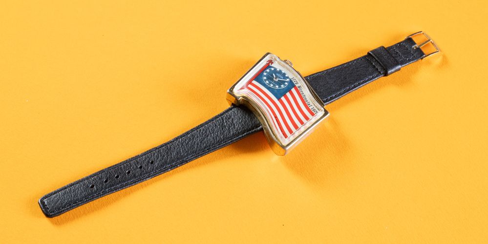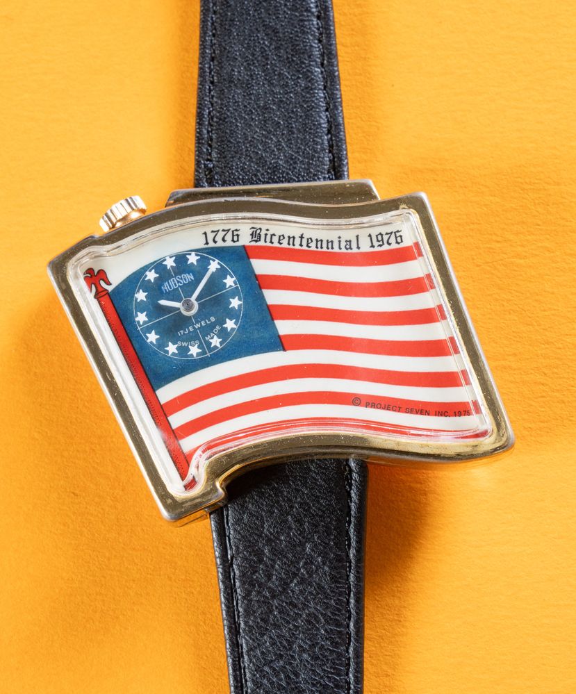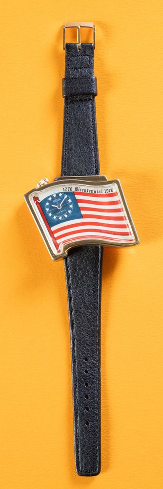 OROLOGIO HUDSON BANDIERA AMERICA, anni '70. Cassa in plastica color oro, circa 40x50mmm, quadrante raffigurante la bandiera americana. Quando l’orologio è in funzione il disco con le stelline gira segnando il rintocco dei secondi. Movimento meccanico a carica manuale, cinturino in pelle. Orologio commemorativo dei 200 anni dalla fondazione degli Stati Uniti d’America 1776 - 1976.
