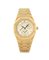 Cassa massiccia n. D21635 in oro giallo 18 kt con fondello e lunetta ottagonale chiusi da viti, vetro zaffiro (ottimo). Quadrante avorio Grande Tapisserie con indici applicati, data a sfera al 2, riserva di carica al 10 e quadrantino a 2 lancette per secondo fuso al 6 (ottimo). Movimento a carica automatica (ottimo). Bracciale in oro giallo 18 kt. Quadrante, cassa, movimento e bracciale firmati. Completo di astuccio originale.