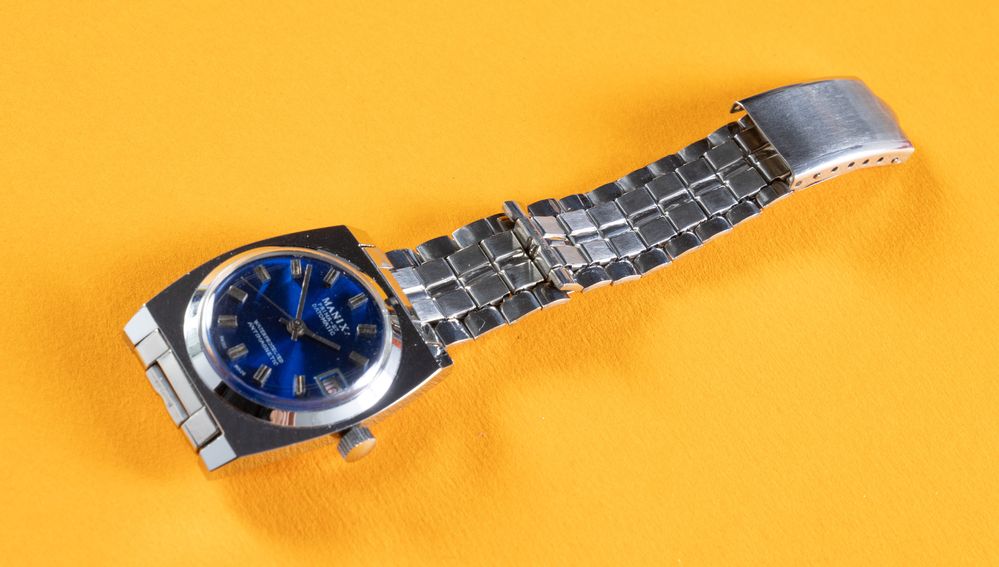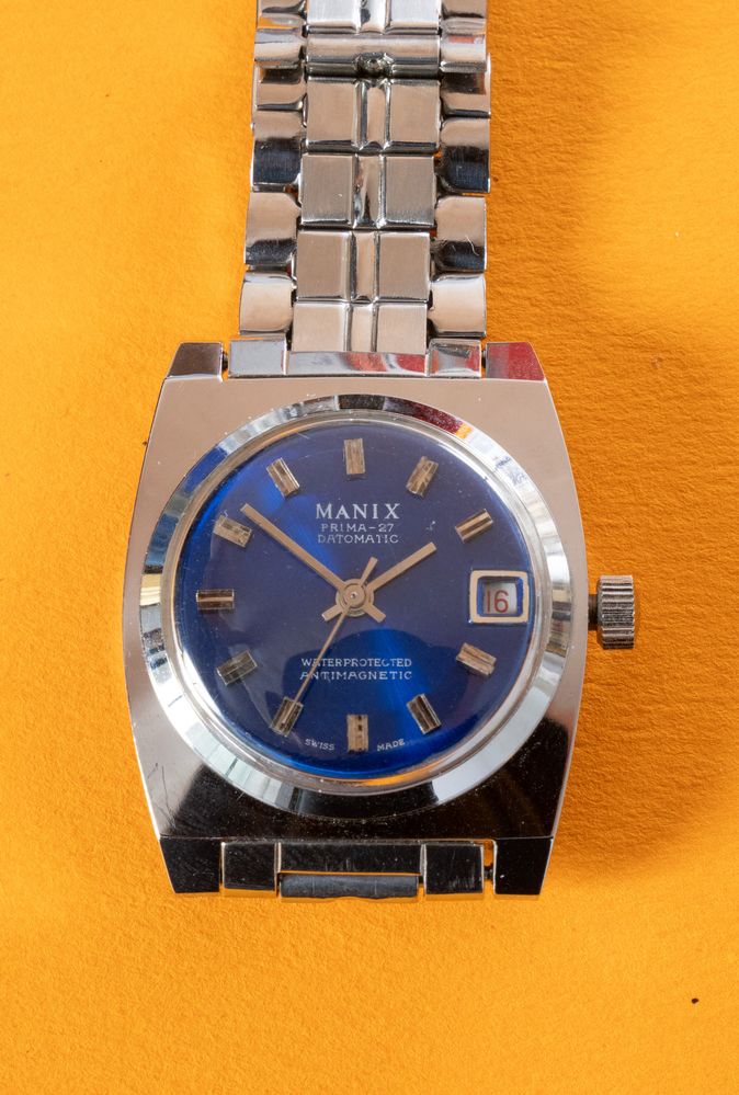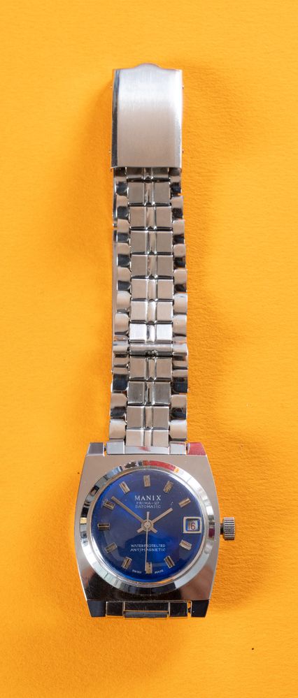 MANIX DATOMATIC, anni '70. Cassa tonneau in acciaio, quadrante blu , indici applicati, indicazione della data, movimento a carica manuale, bracciale in acciaio. Diametro 32x37mm.