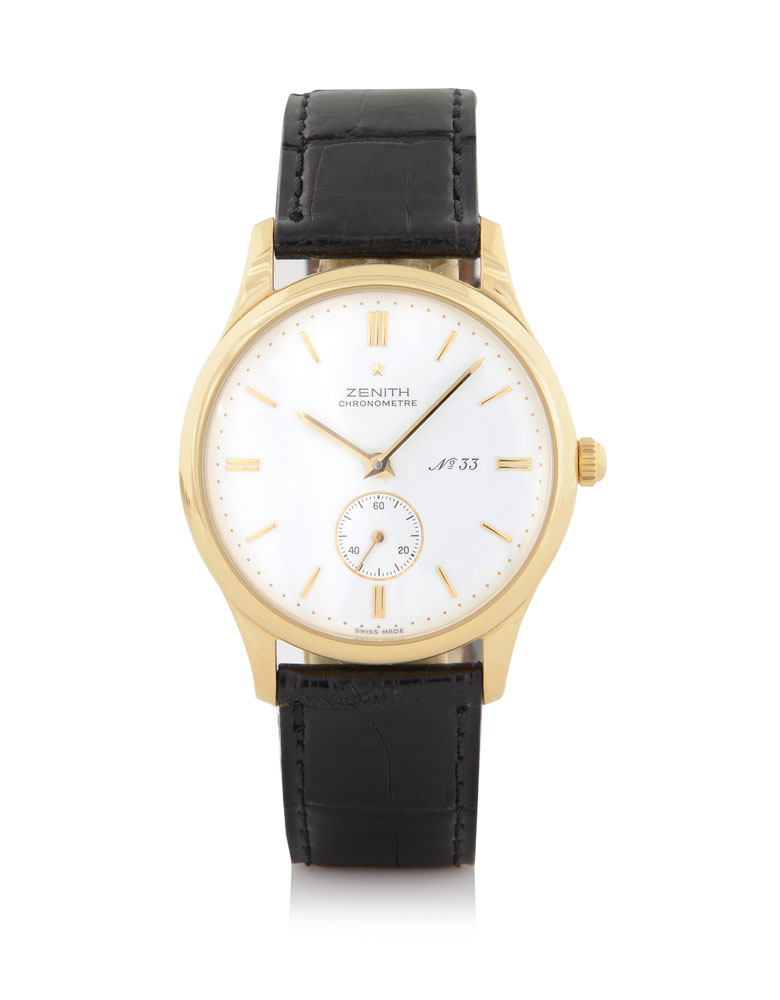 Diam. mm 35. C. 18K yellow gold (very good). D. white with applied indexes and subsidiary seconds (very good). M. manual winding (good). Dial, case and movement signed. Accompanied by Zenith strap and 18K yellow gold buckle.