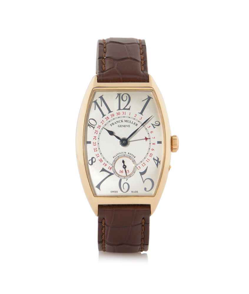 Dim. mm 45x30. C. tonneau-shaped 18K pink gold with curved sapphire crystal (very good). D. silvered with painted Arabic numerals, subsidiary seconds and additional central hand for date (very good). M. self-winding with platinum rotor (very good). Dial, case and movement signed. Frank Muller strap and pink gold buckle.