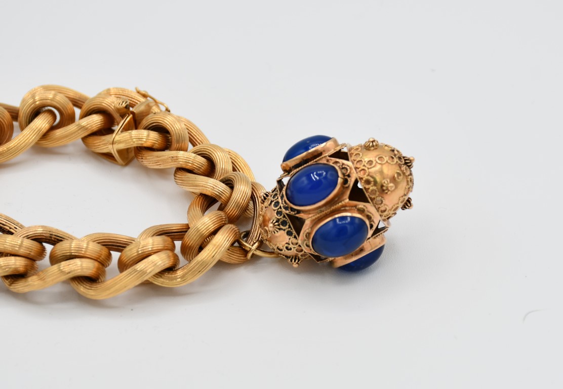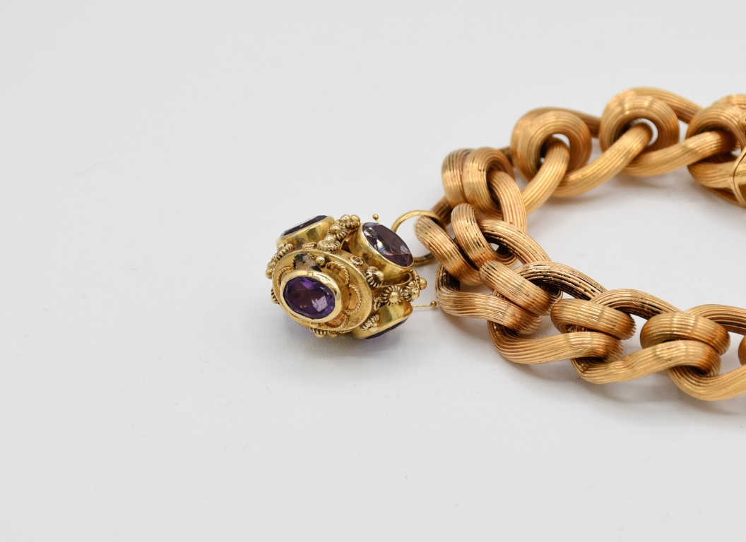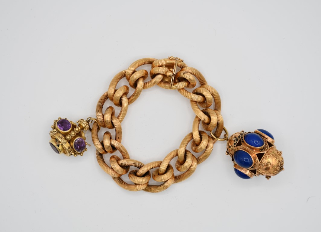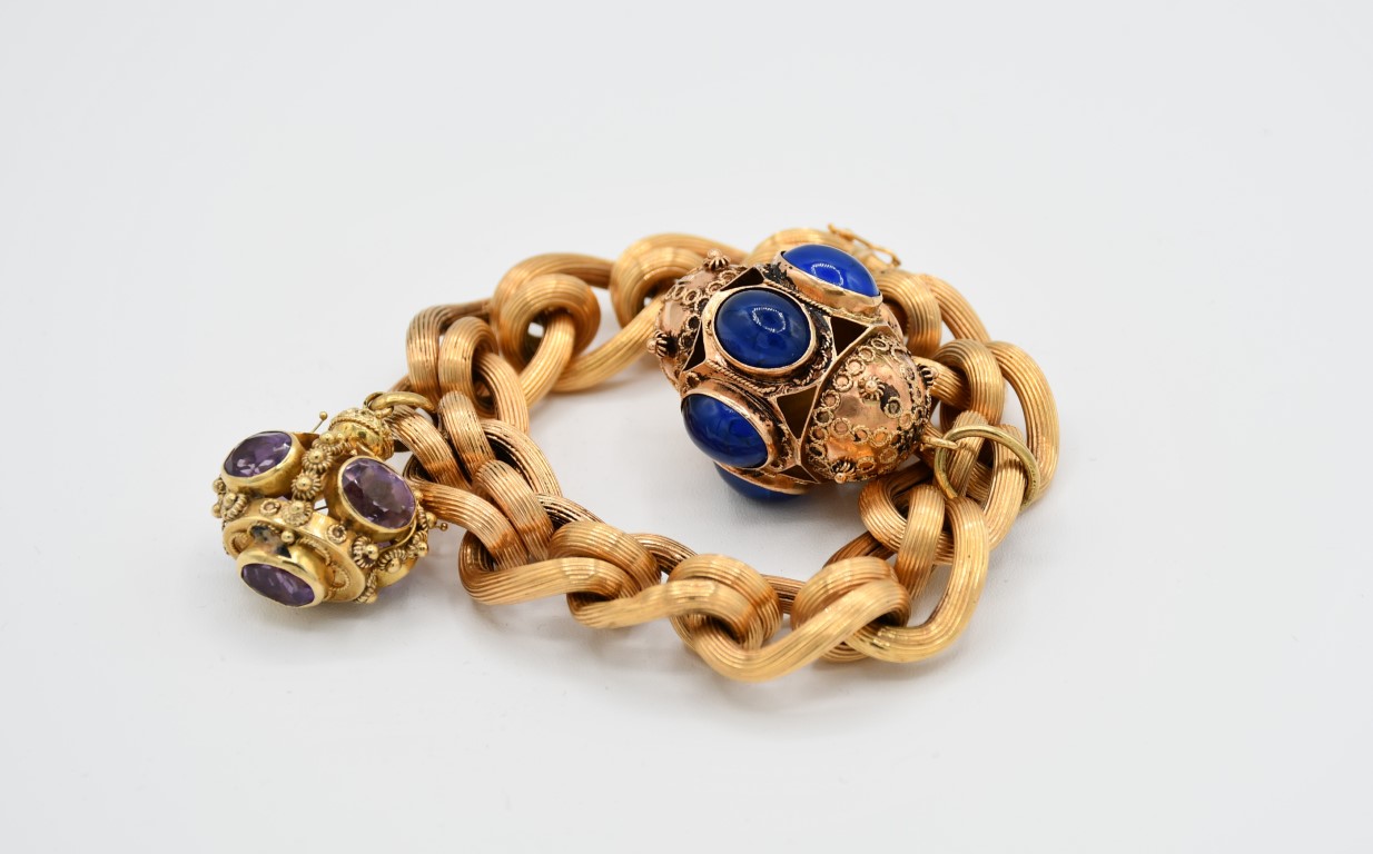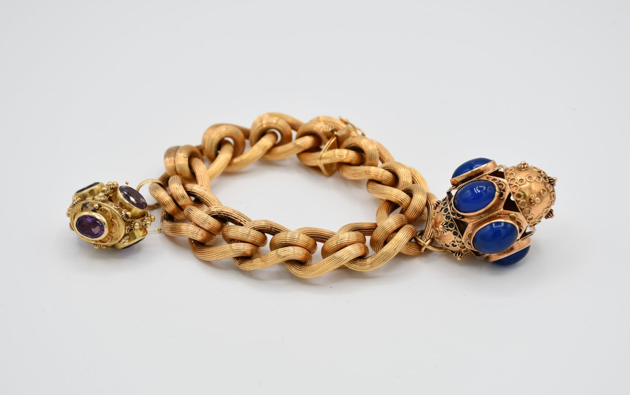 Bracciale in oro 750, con due charms, con ametiste e vetri blu, manifattura di Vicenza
