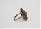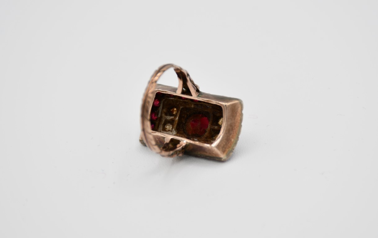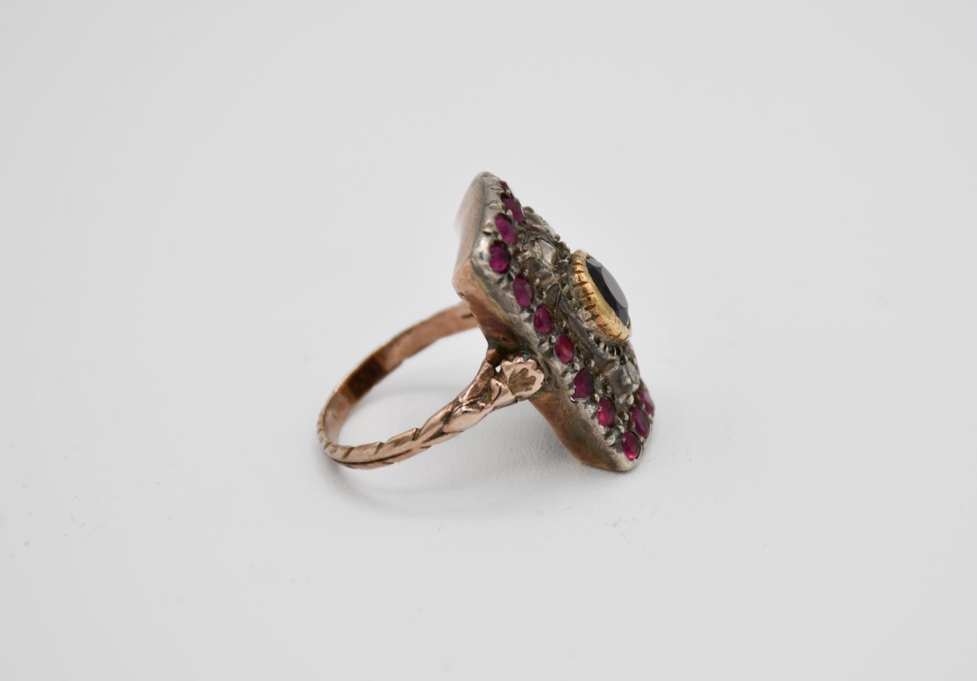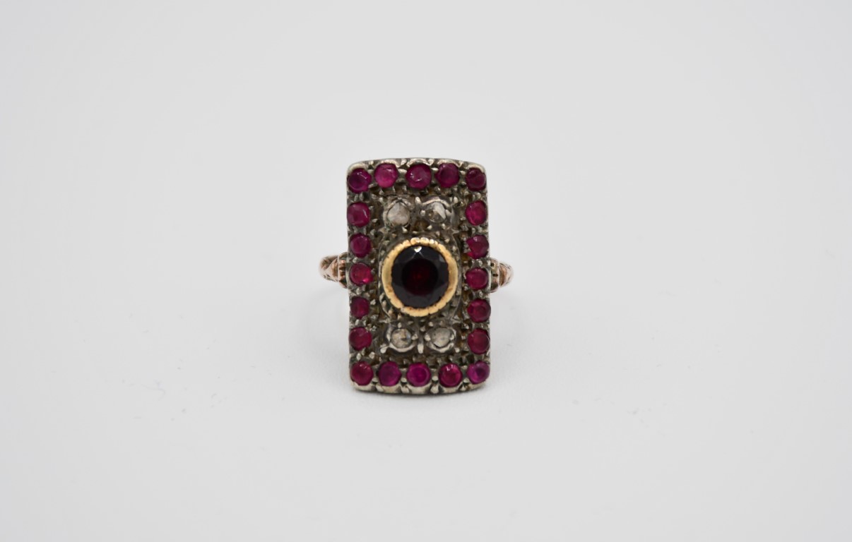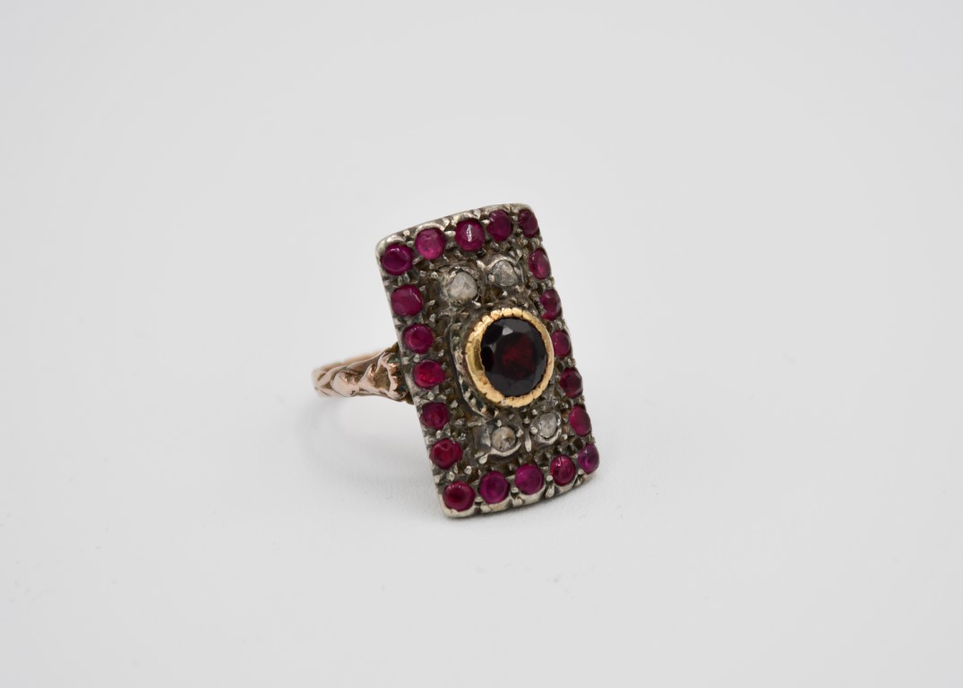 Anello in oro basso e argento, con granato centrale, 4 diamanti e 20 rubini
