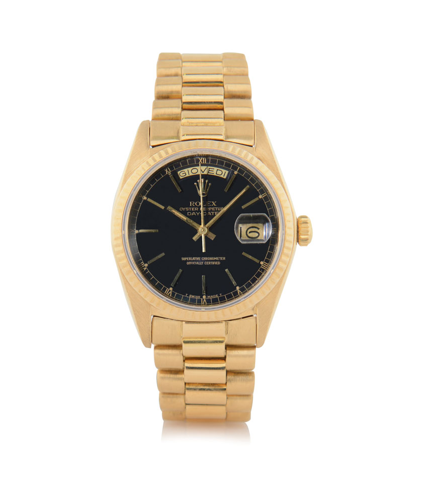 Cassa n. 5600012 in oro giallo 18 kt con fondello e corona a vite, lunetta godronata e vetro zaffiro (ottimo). Quadrante nero con indici applicati, secondi al centro, finestrella per giorno, italiano, al 12 e data al 3 (originale, ottimo). Movimento a carica automatica (ottimo). Bracciale President in oro giallo 18 kt con chiusura a scomparsa. Quadrante, cassa, movimento e bracciale firmati.