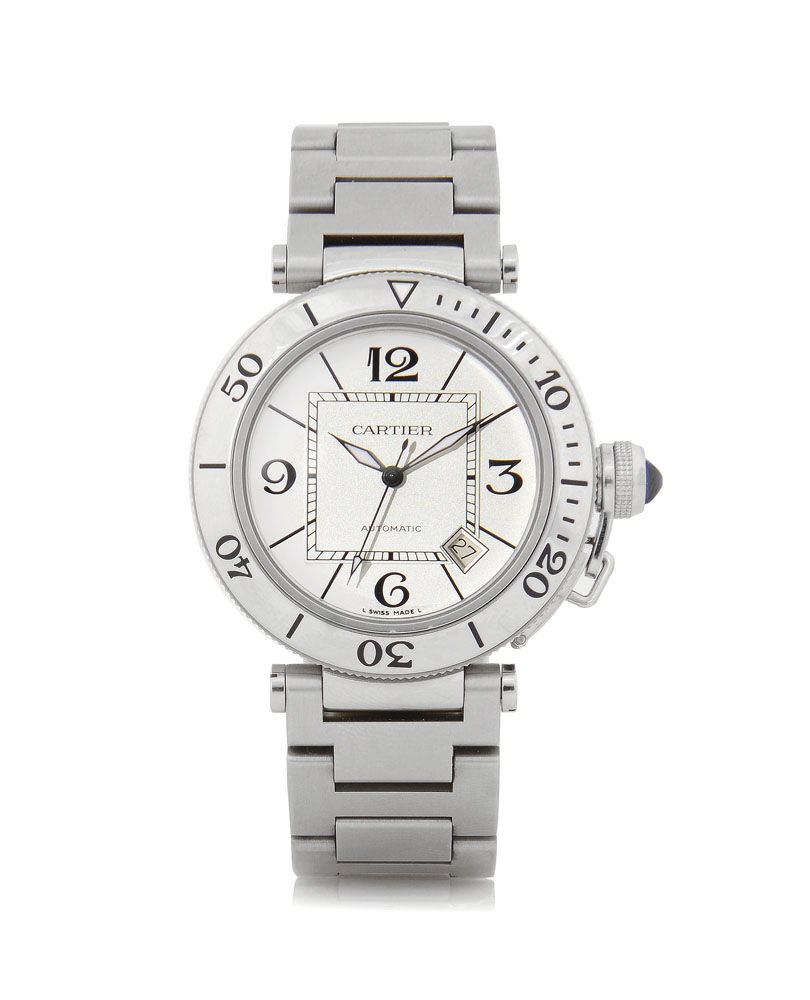 Diam. mm 40. C. stainless steel, transparent case back secured by screws, revolving graduated bezel and sapphire crystals (very good). D. silvered with luminous indexes and hands, painted Arabic numerals and indexes, centre seconds, date between 4 and 5 (very good). M. self-winding (good). Stainless steel bracelet whit double-deployant clasp. Dial, case, movement and bracelet signed. Accompanied by Cartier Box and certificate dated 03/2007.