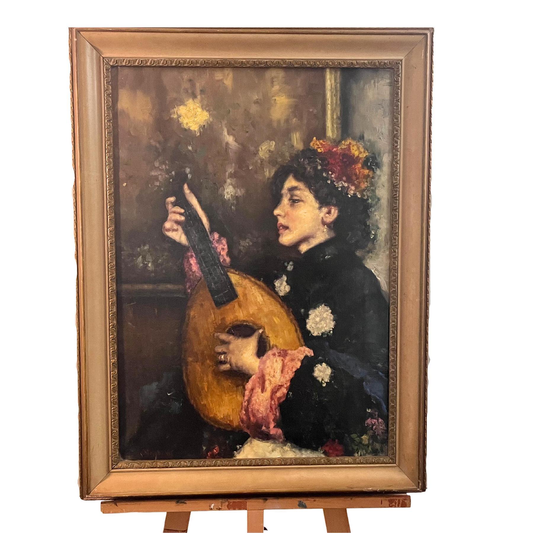 Dipinto olio su tela. Ragazza con mandolino. Copia da Antonio Mancini. XX secolo. Artista anonimo.