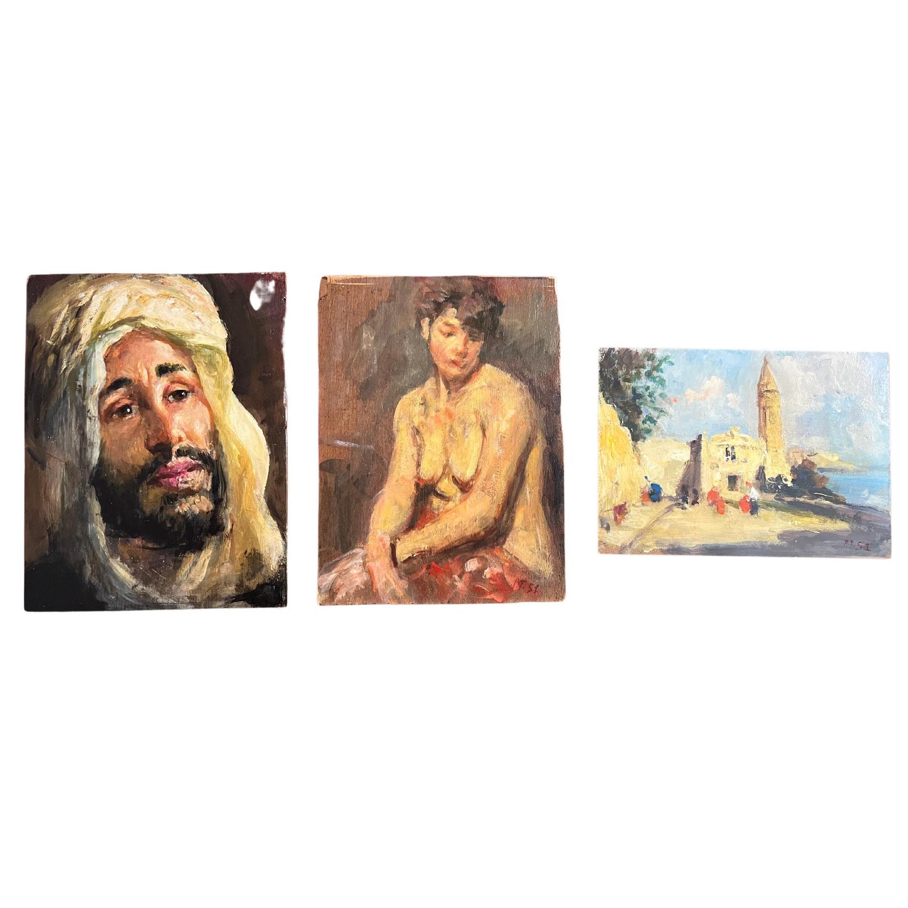Lotto di tre piccoli dipinti olio su pannello, periodo XX secolo raffiguranti: Ritratto di uomo orientale, paesaggio, ritratto di donna. Artista anonimo.