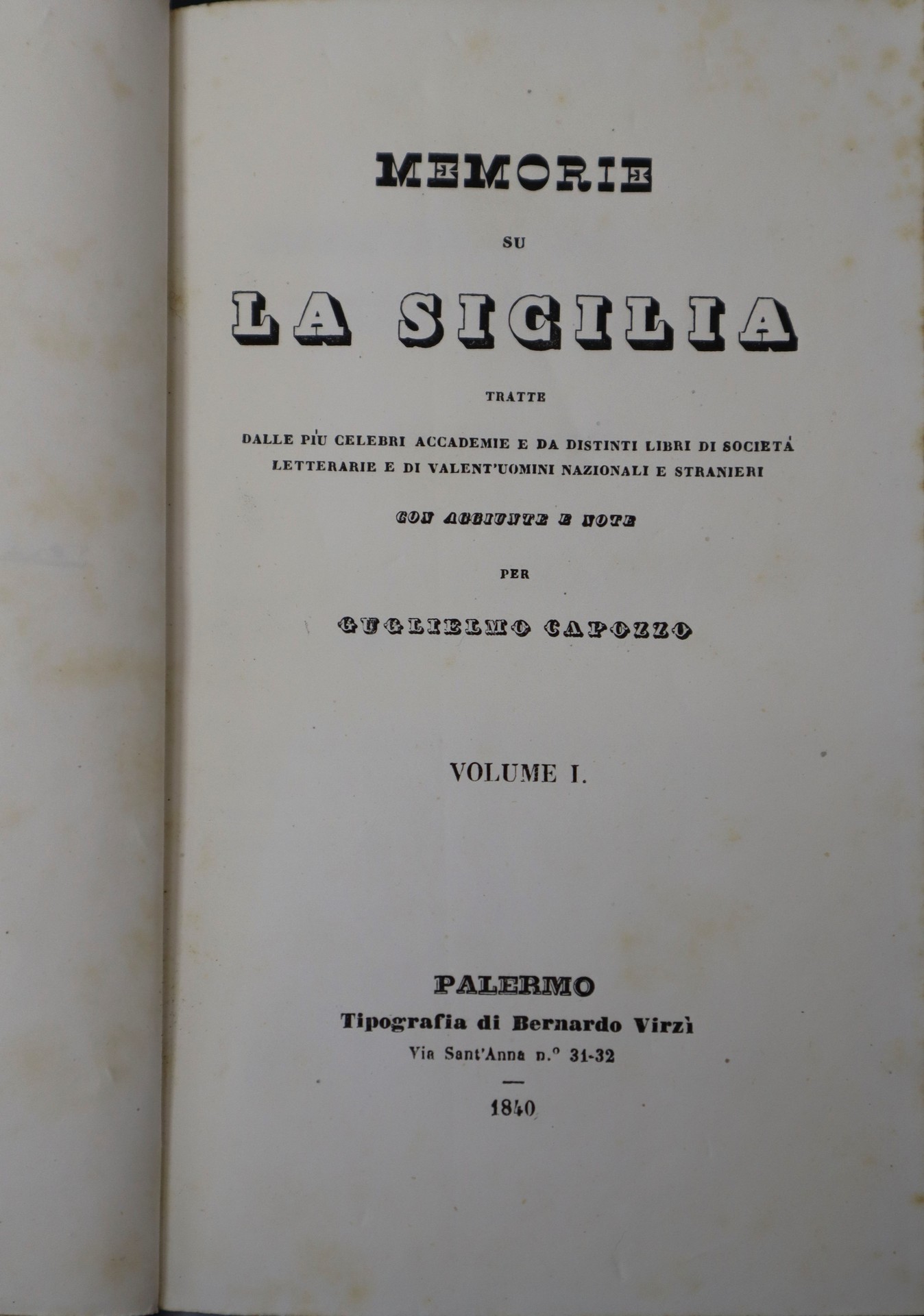 Lotto 50 | Memorie sulla Sicilia di Guglielmo Capozzo, Volume 1 e Volume 2, Palermo 1840