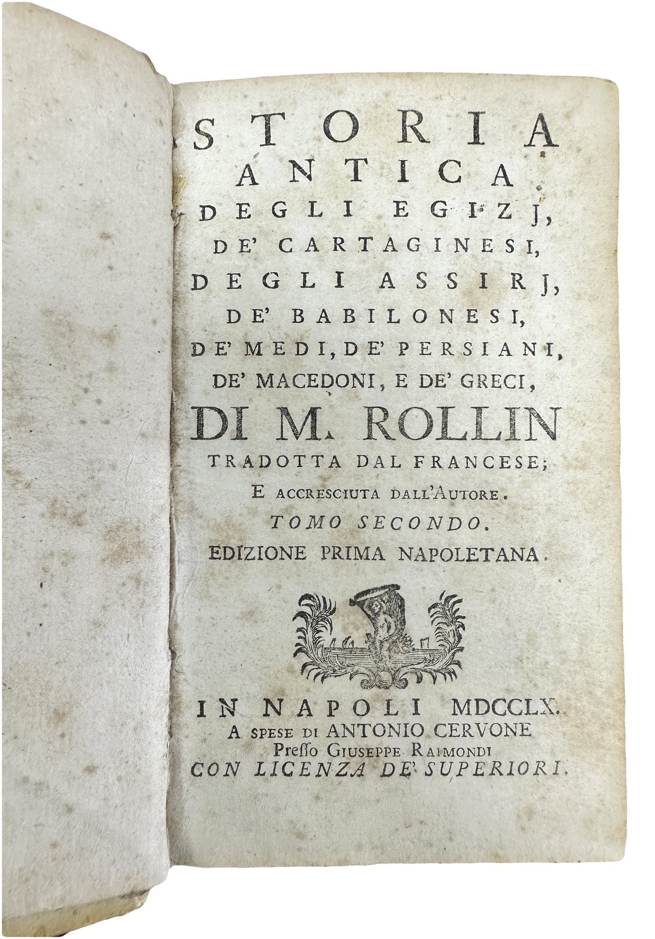Storia antica degli egizj, de' cartaginesi, degli assirj, de' babilonesi, de' medi, de' persiani, de' macedoni, e de' greci Di M. Rollin. Tradotta dal francese. Tomo secondo. Edizione prima napoletana. Napoli, 1760. Copertina in carta pecora.Di M. Rollin. Tradotta dal francese. Tomo secondo. Edizione prima napoletana. Napoli, 1760. Copertina in carta pecora.