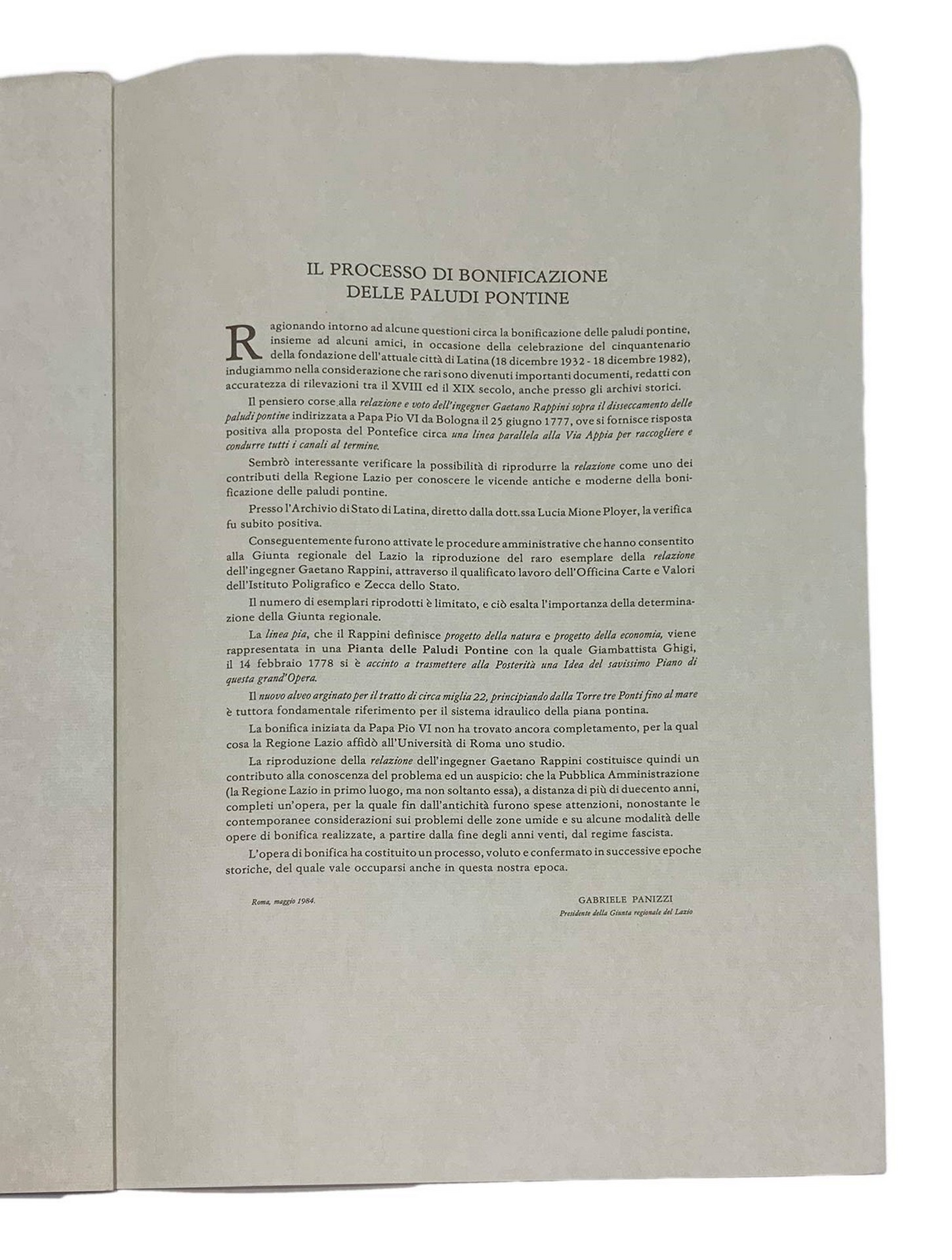 Relazione e Voto dell’ingegnere Gaetano Rappini sopra il disseccamento delle Paludi Pontine alla Santità di N.S. Papa Pio VI, 1983 Relazione e Voto dell’ingegnere Gaetano Rappini sopra il disseccamento delle Paludi Pontine alla Santità di N.S. Papa Pio VI, Roma 1983. In folio tela ornata in oro, 42 pagine, 55 tavole a colori di qui 21 pieghevoli 1 carta inserita. Facsimile del manoscritto dell'ing. Rappini (1734-1796). Ottimo stato.Relazione e Voto dell’ingegnere Gaetano Rappini sopra il disseccamento delle Paludi Pontine alla Santità di N.S. Papa Pio VI, Roma 1983. In folio tela ornata in oro, 42 pagine, 55 tavole a colori di qui 21 pieghevoli 1 carta inserita. Facsimile del manoscritto dell'ing. Rappini (1734-1796). Ottimo stato.