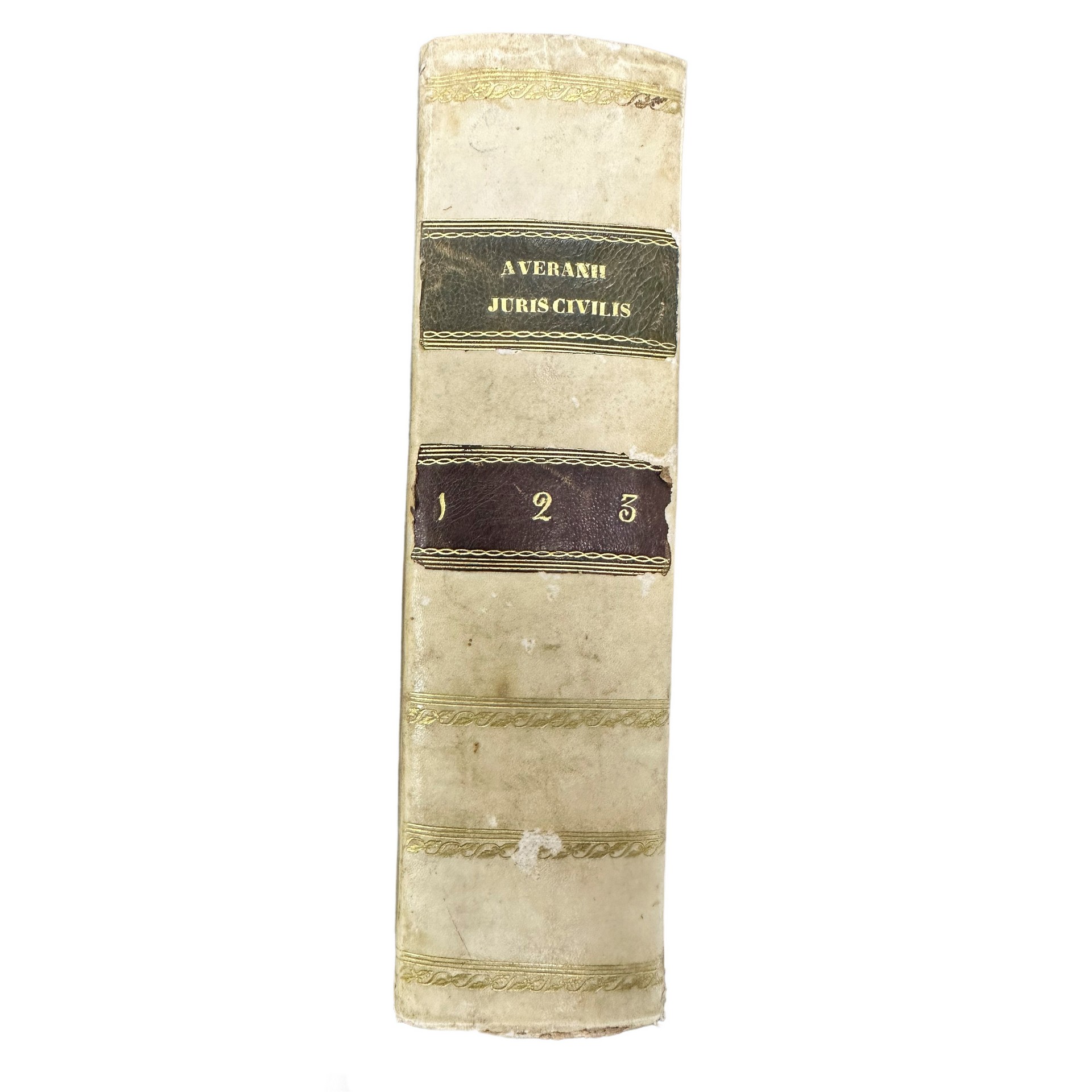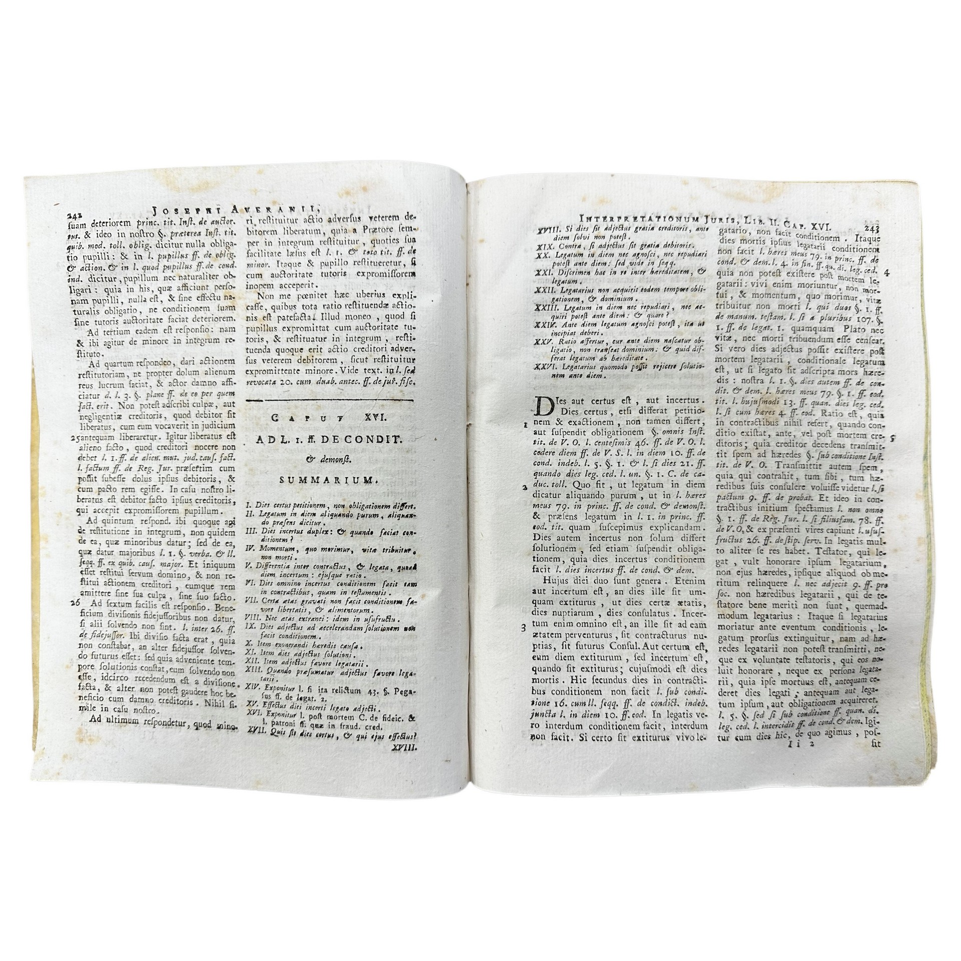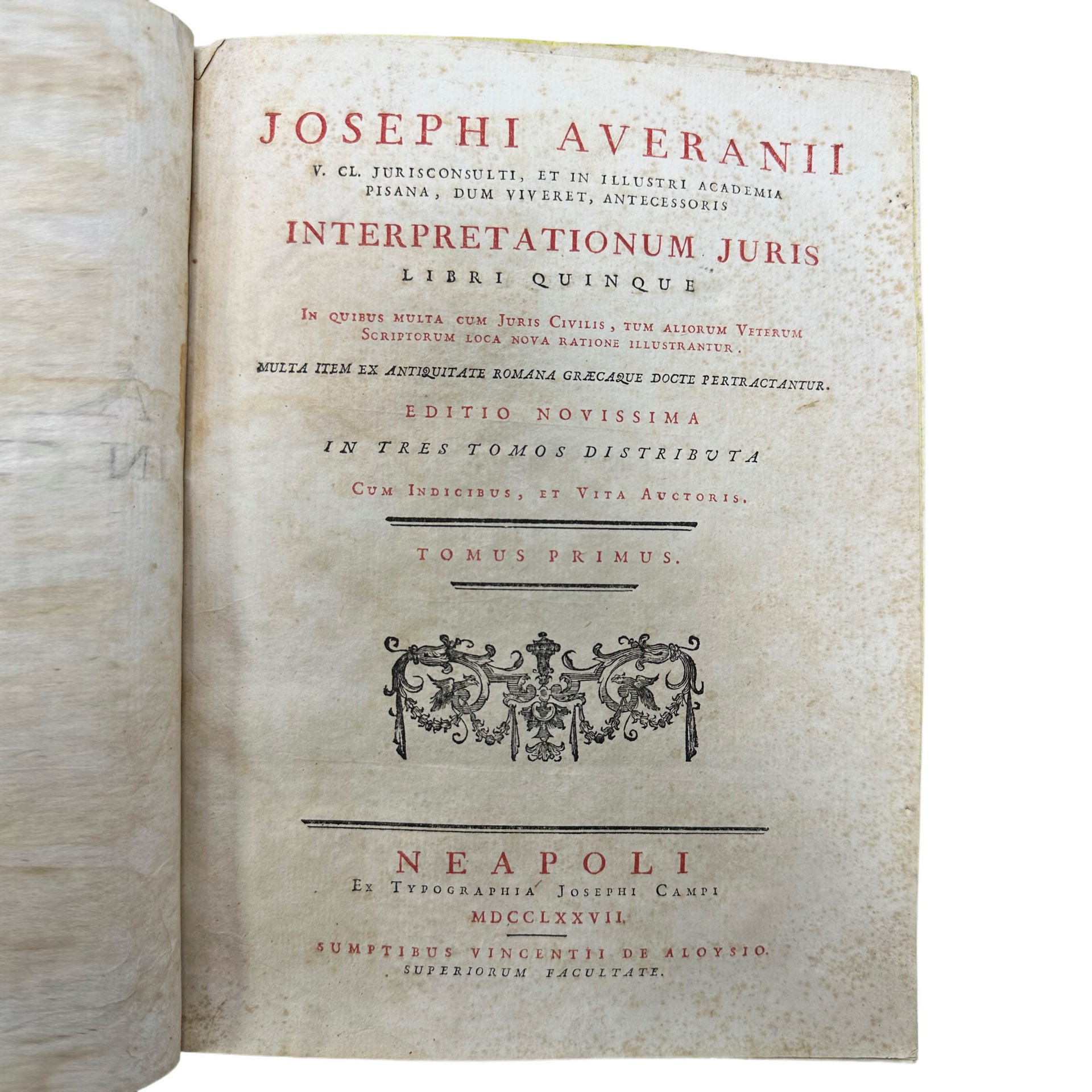 Josephi Averanii, Interpretationum Juris, Libri Quinque. Tomo primo, 1777 Editio novissima, in tres tomos distribuita cum indicibus, et vita auctoris. Neapoli, Ex typographia Josephi Campi. Sumptibus vincentii de aloysio, superiorum facultate. Copertina in carta pecora.Editio novissima, in tres tomos distribuita cum indicibus, et vita auctoris. Neapoli, Ex typographia Josephi Campi. Sumptibus vincentii de aloysio, superiorum facultate. Copertina in carta pecora.