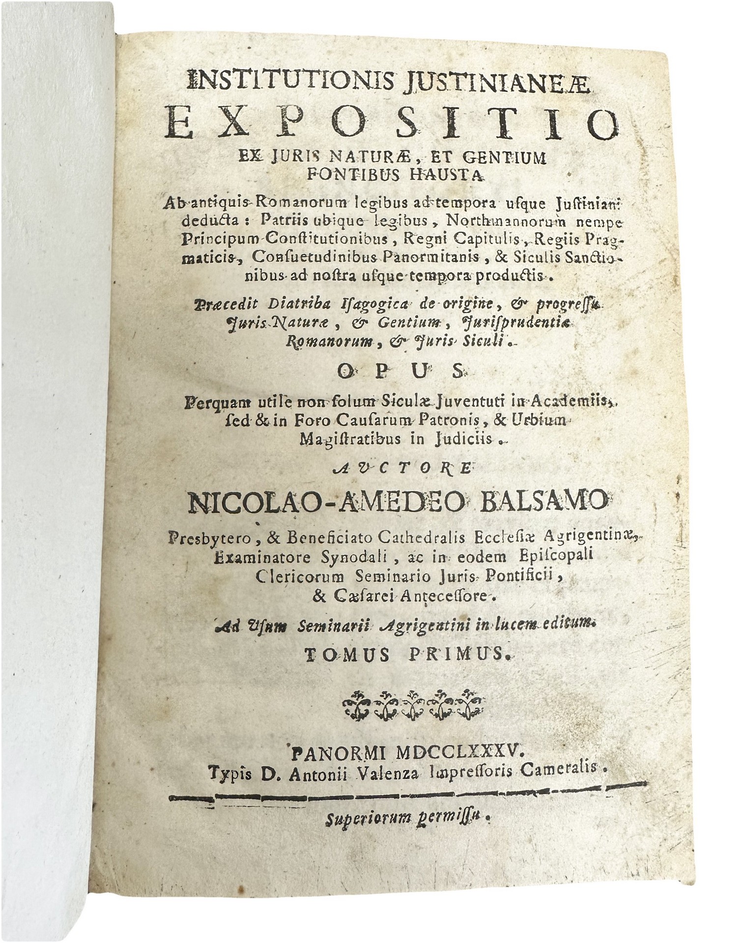 Institutionis justinianeae expositio ex juris naturae, et gentium fontibus hausta. Tomo primo, 1785 Autore: Nicolao-Amedeo Balsamo. Panormi. Typis D. Antonii Valenza Impressoris Cameralis.Autore: Nicolao-Amedeo Balsamo. Panormi. Typis D. Antonii Valenza Impressoris Cameralis.