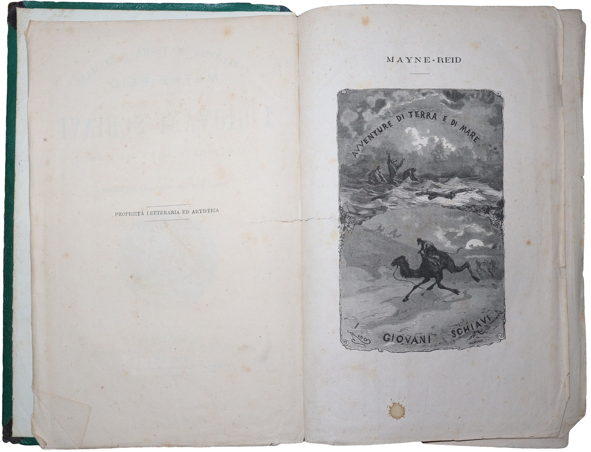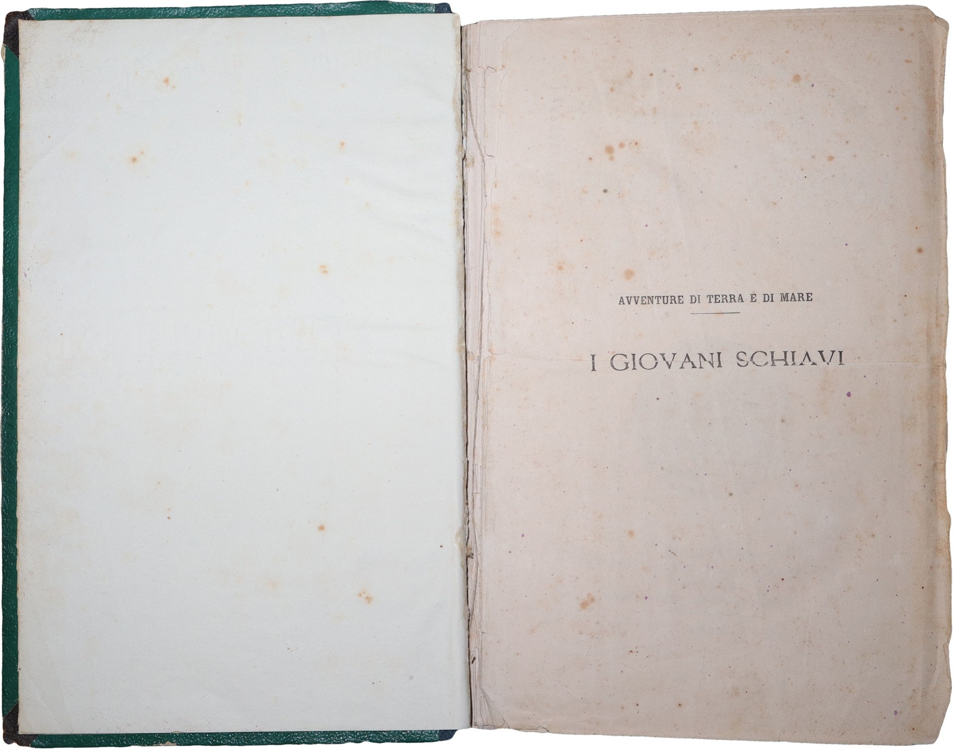 I giovani schiavi avventure di terra e mare, 1874 Illustrato da 27 incisioni, bibllioteca di educazione e di ricreazione. Milano, tipografia editrice lombarda, Via Larga, N.19. Presenti fioriture, strappi e sfilaciature nella rilegatura e in alcune pagineIllustrato da 27 incisioni, bibllioteca di educazione e di ricreazione. Milano, tipografia editrice lombarda, Via Larga, N.19. Presenti fioriture, strappi e sfilaciature nella rilegatura e in alcune pagine