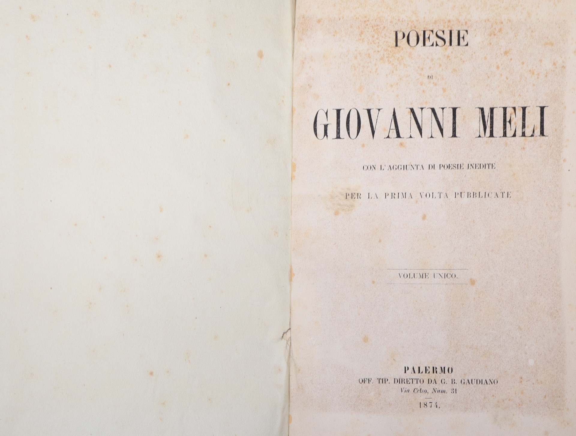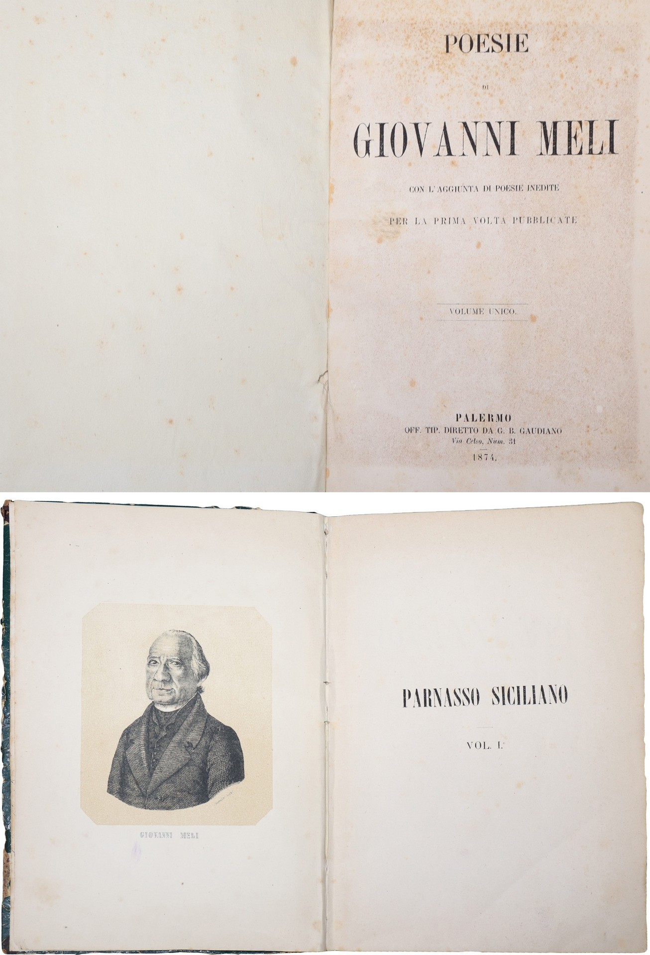 Giovanni Meli (Palermo 1740-Palermo 1815) - Coppia libri Poesie di Giovanni Meli, 1874 Con l'aggiunta di poesie inedite per la prima volta pubblicate, volume unico, Palermo. Presenti fioritureCon l'aggiunta di poesie inedite per la prima volta pubblicate, volume unico, Palermo. Presenti fioriture