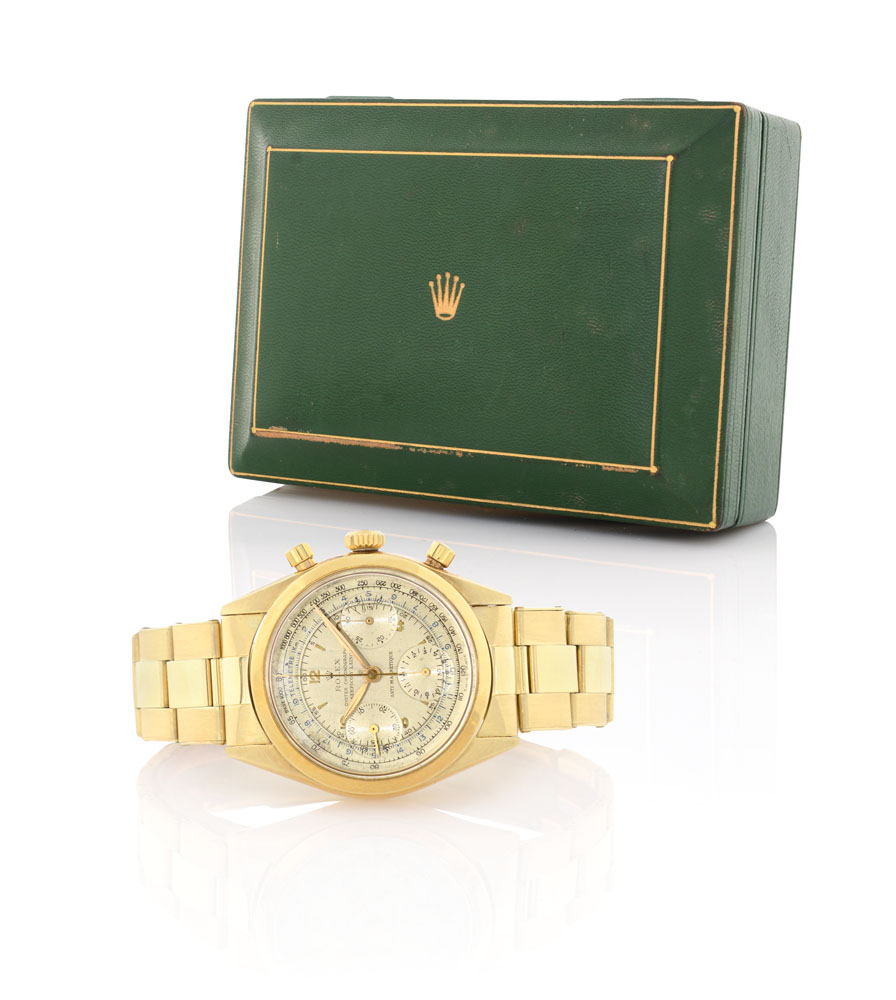 Cassa n. 144298 in oro giallo 14 kt con fondello e corona a vite, pulsanti tondi (ottimo). Quadrante argentato con indici e numero arabo applicati, contatore a 30 minuti e 12 ore, scala tachimetrica e telemetrica periferica (originale, lievemente patinato, buono). Movimento Valjoux cal. 72 a carica manuale (ottimo). Bracciale Oyster in oro giallo 14 kt. Quadrante, cassa, movimento e bracciale firmati. Completo di astuccio originale.