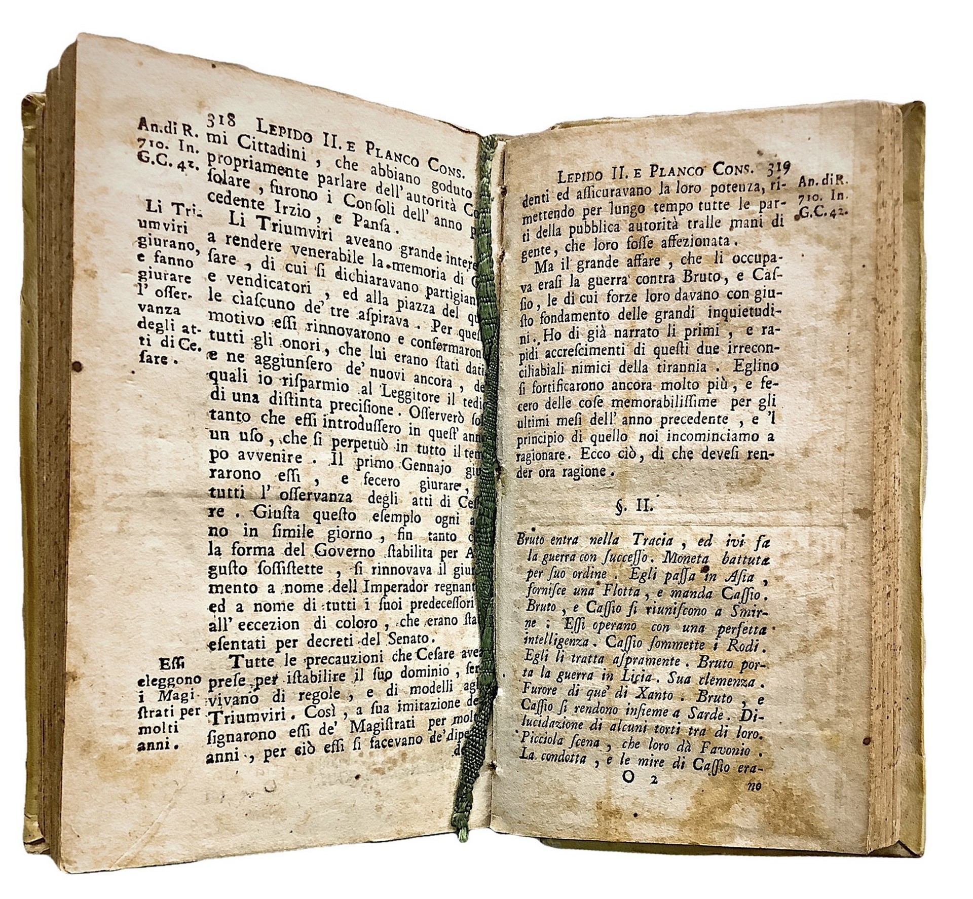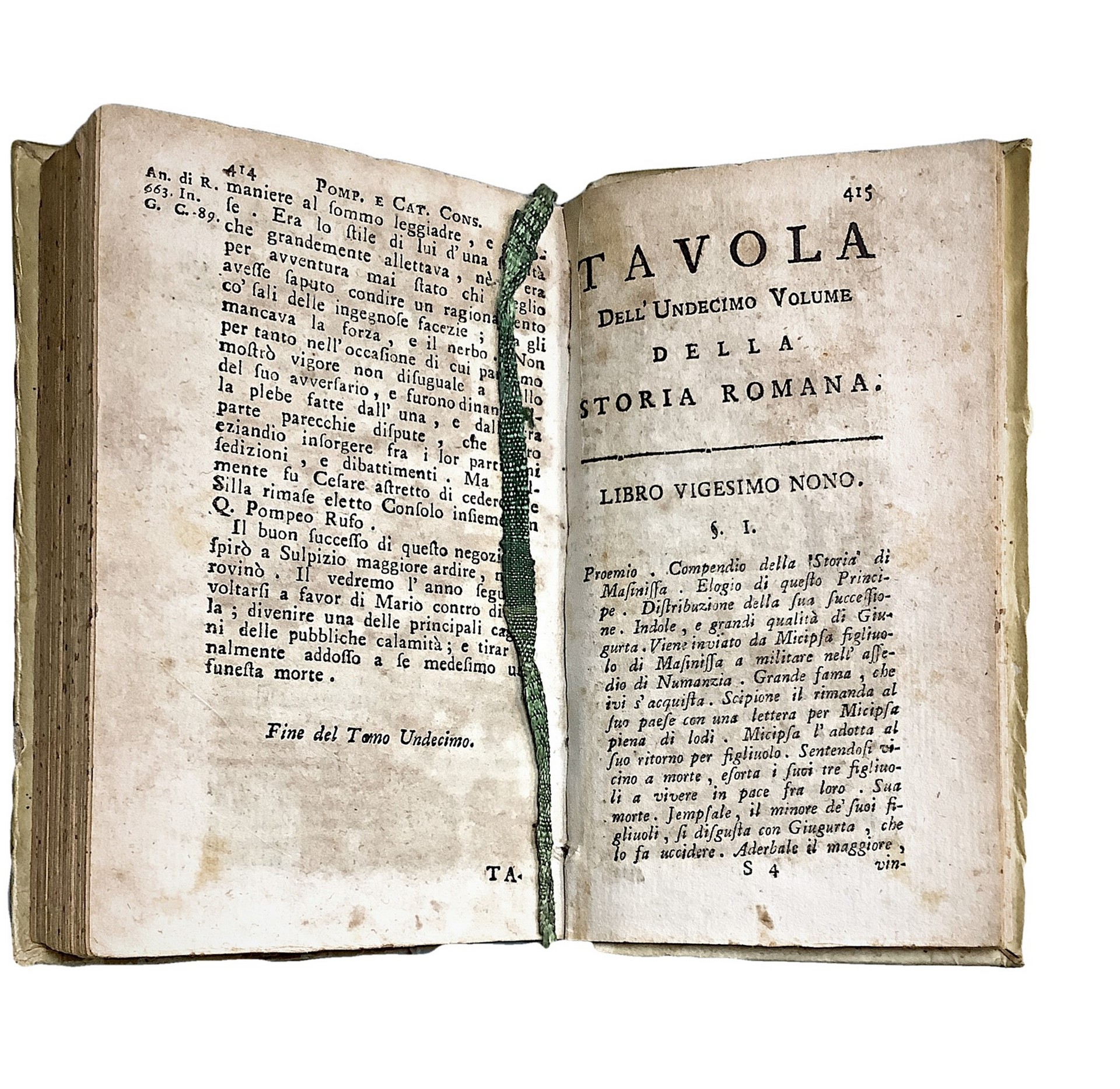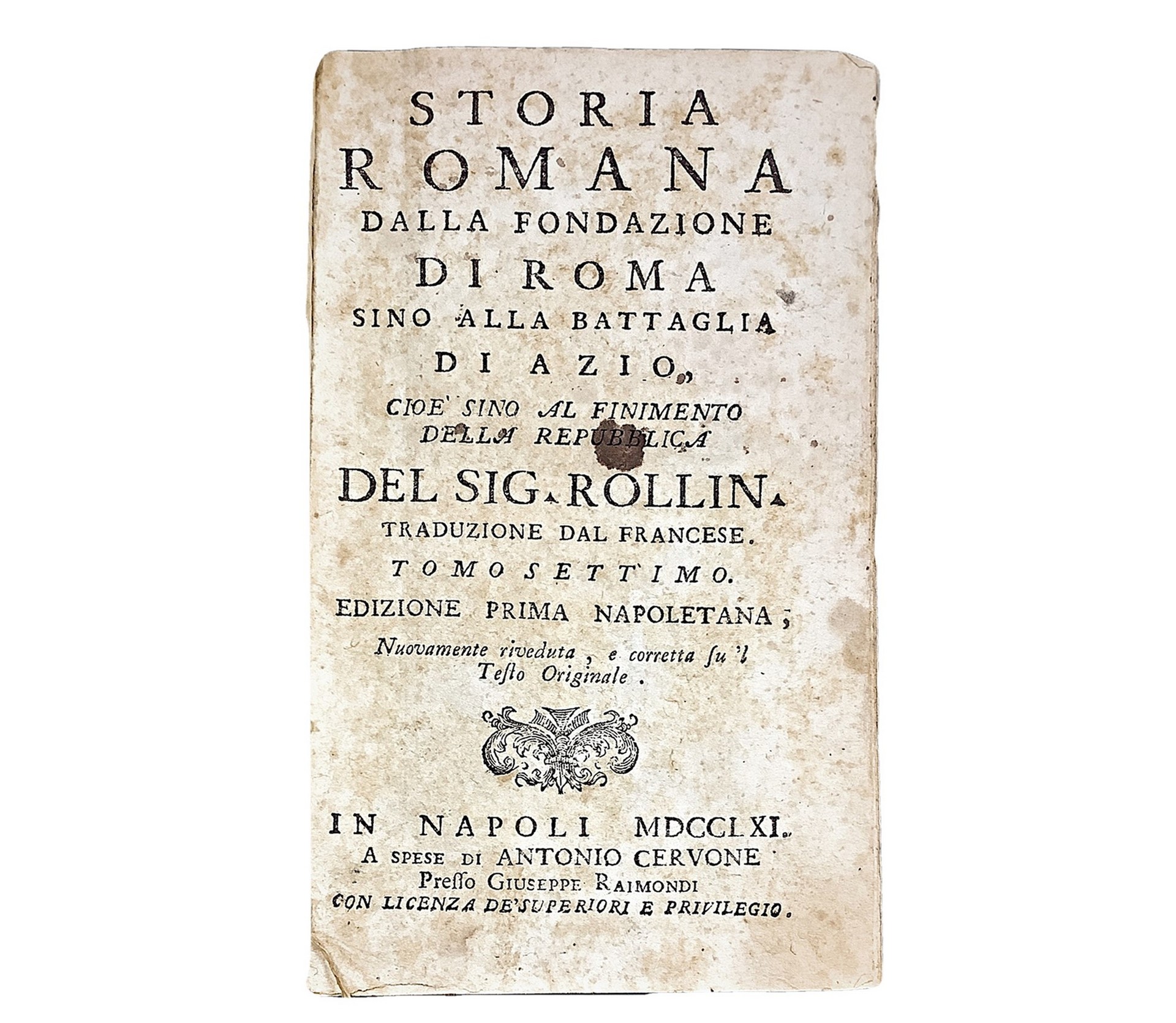 Storia romana, 1761 Dalla fondazione di Roma sino alla battaglia di Azio cioè sino al finimento della repubblica. Opera incompleta, presenti tomo settimo, undecimo, decimosettimo e decimottavo. Napoli, a spese di Antonio Cervone. Presenti sfilacciature e fioritureDalla fondazione di Roma sino alla battaglia di Azio cioè sino al finimento della repubblica. Opera incompleta, presenti tomo settimo, undecimo, decimosettimo e decimottavo. Napoli, a spese di Antonio Cervone. Presenti sfilacciature e fioriture